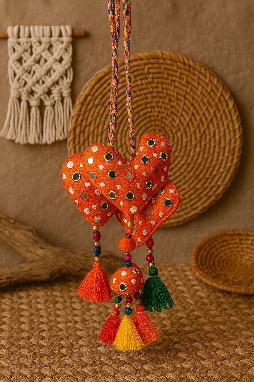 Playful, vibrant, and full of bohemian spirit, the Boho Love Trails - Braided hair tie is a handcrafted accessory designed to add a pop of color and personality to your style. Featuring soft Bandhani-inspired fabric hearts adorned with mirror accents, this charming piece is finished with colorful beads and lively tassels that create beautiful movement.