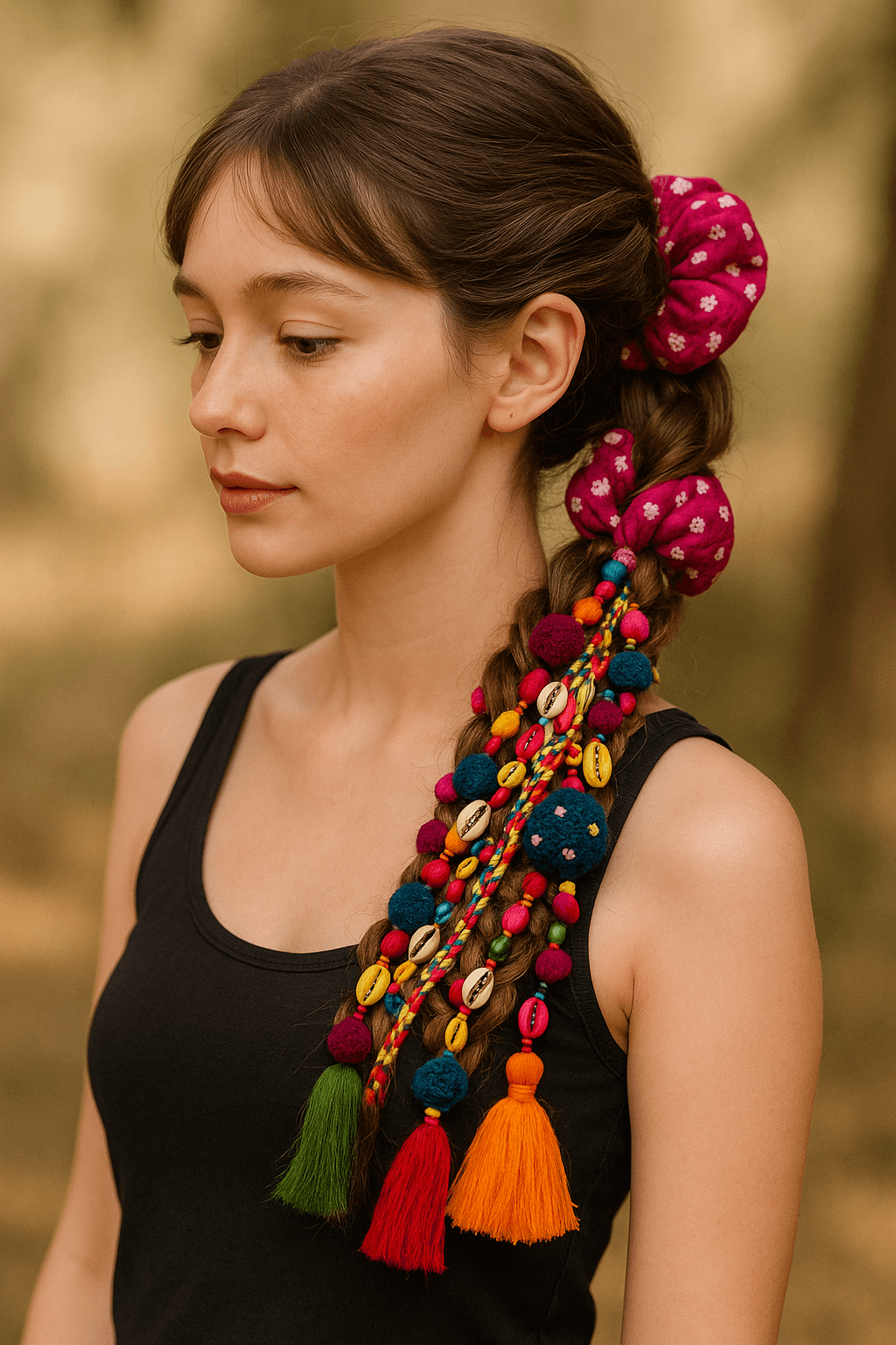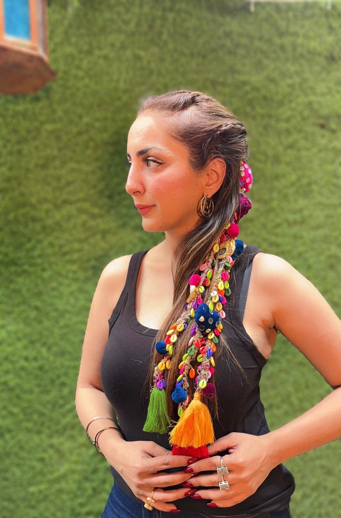 Style it into a half-up braid like shown for an edgy festival vibe or wrap it around your top knot for an unexpected twist. Works best with solid-color outfits to let the colors shine think black, white, or denim. Pair with oxidized jhumkas or chunky rings to complete the boho bombshell look.