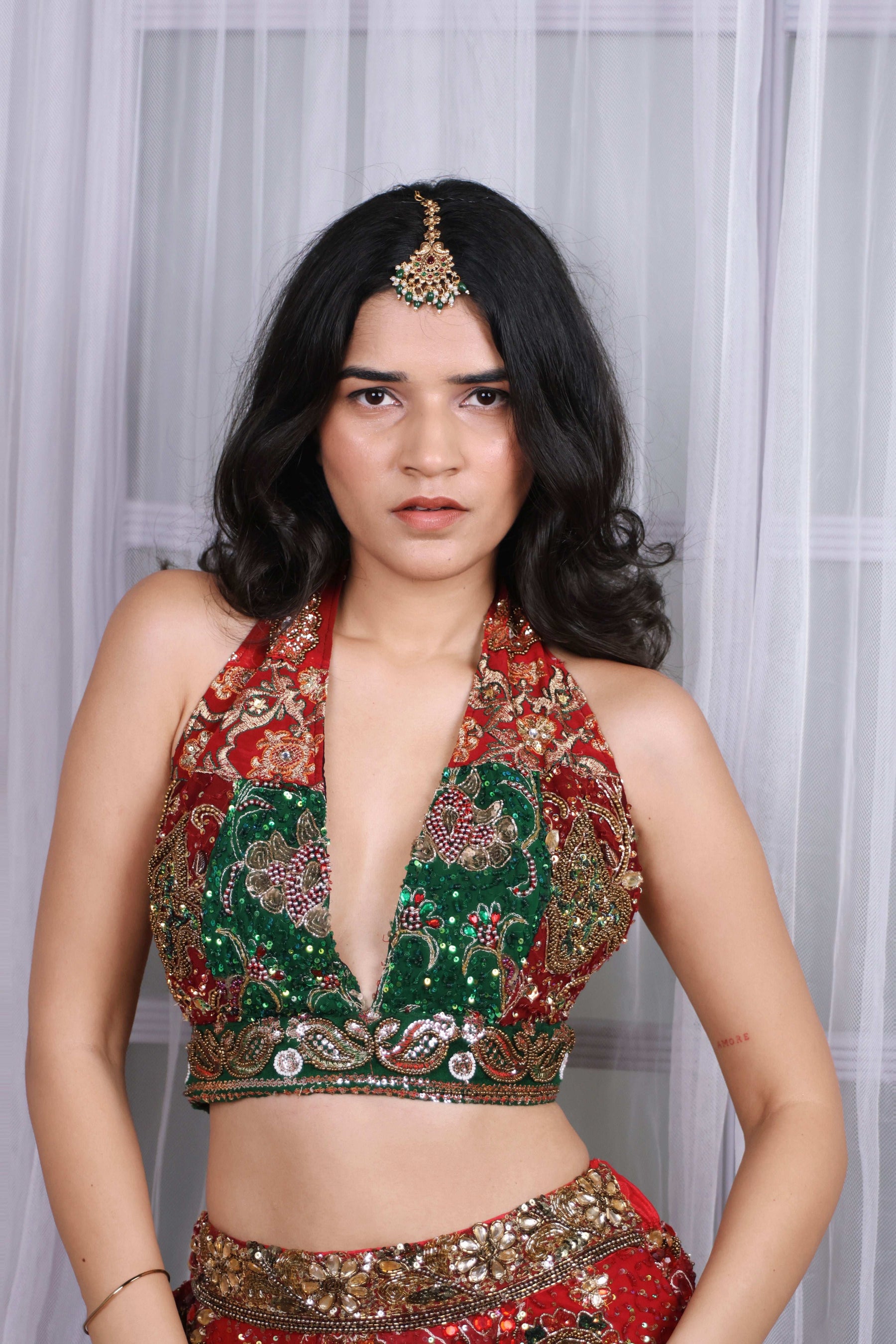 ✨ Halter Blouse: Deep plunge neckline in rich emerald green with intricate hand embroidery, mirror work, and golden embellishments.