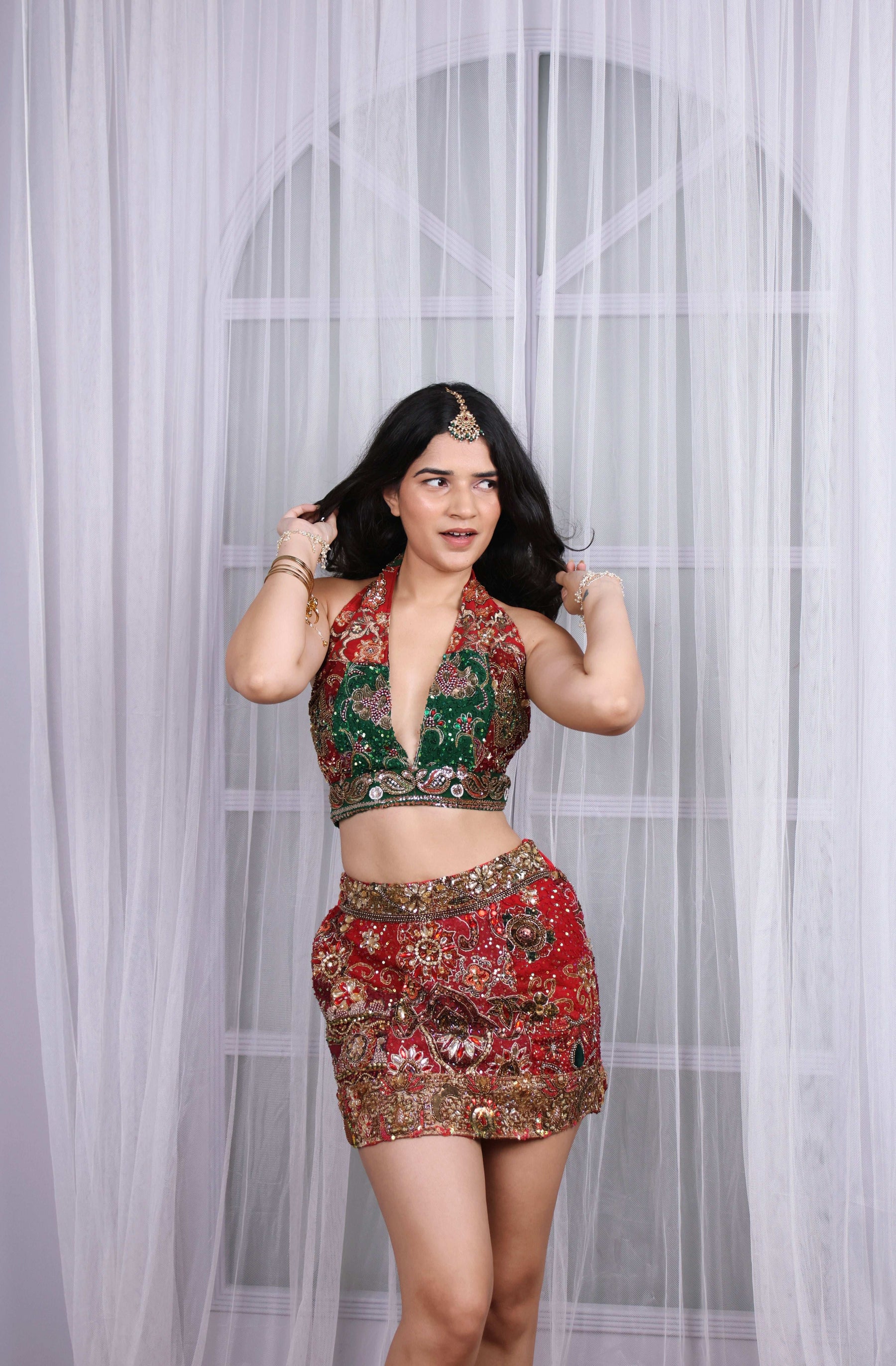 ✨ Mini Skirt: Vibrant red base adorned with heavy thread embroidery, sequins, and mirror details, finished with ornate golden borders.