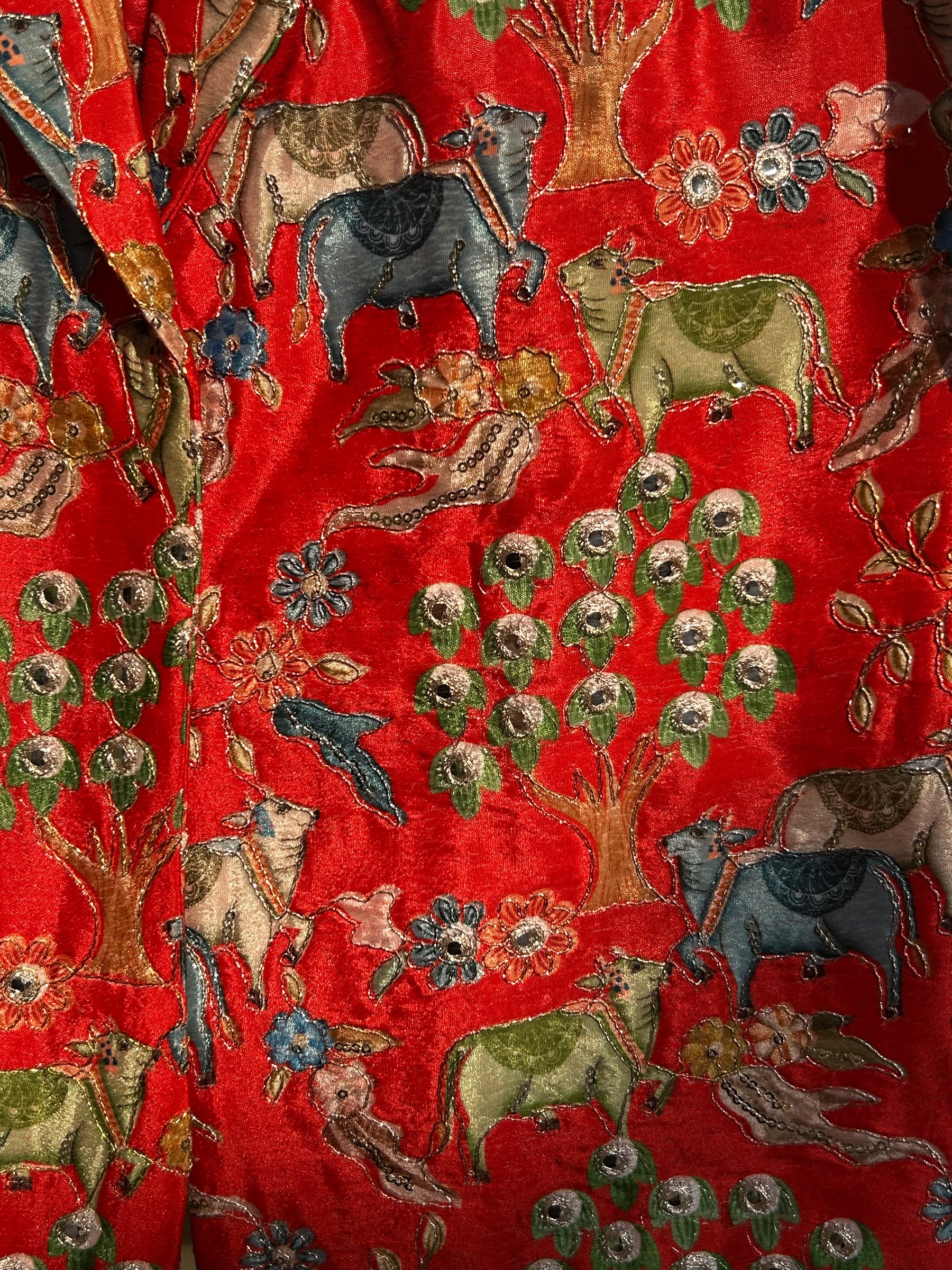 A celebration of royal artistry and heritage craftsmanship, the Rudra Raj Hand-Embroidered kurta is designed for the modern maharaja. Crafted on a vibrant scarlet silk base, this statement kurta showcases intricate multicolour thread embroidery inspired by Indian nature motifs — cows, birds, trees, and florals — symbolising prosperity, grace, and timeless culture.
