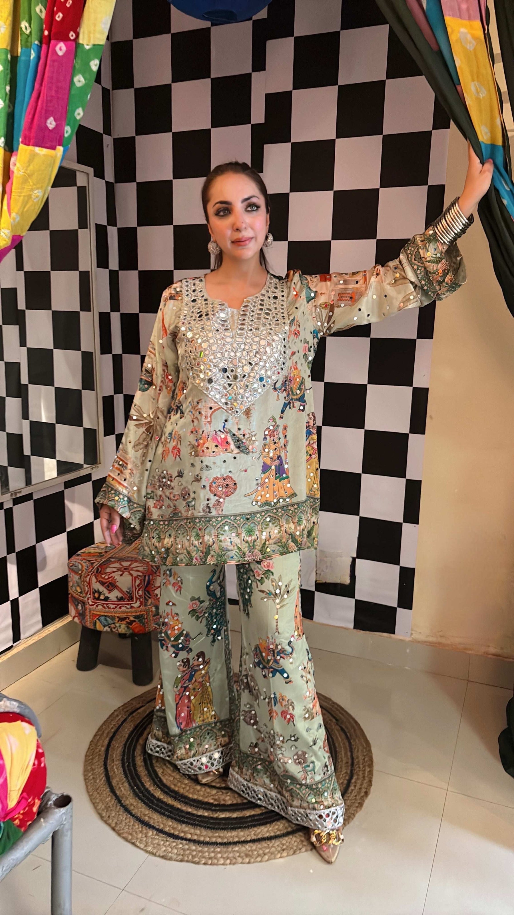 Turn every occasion into a statement with this handcrafted mirror work co-ord set. Designed in a chic silhouette, the outfit brings together traditional hand embroidery with a contemporary cut, making it perfect for festive evenings, card parties, and wedding celebrations.