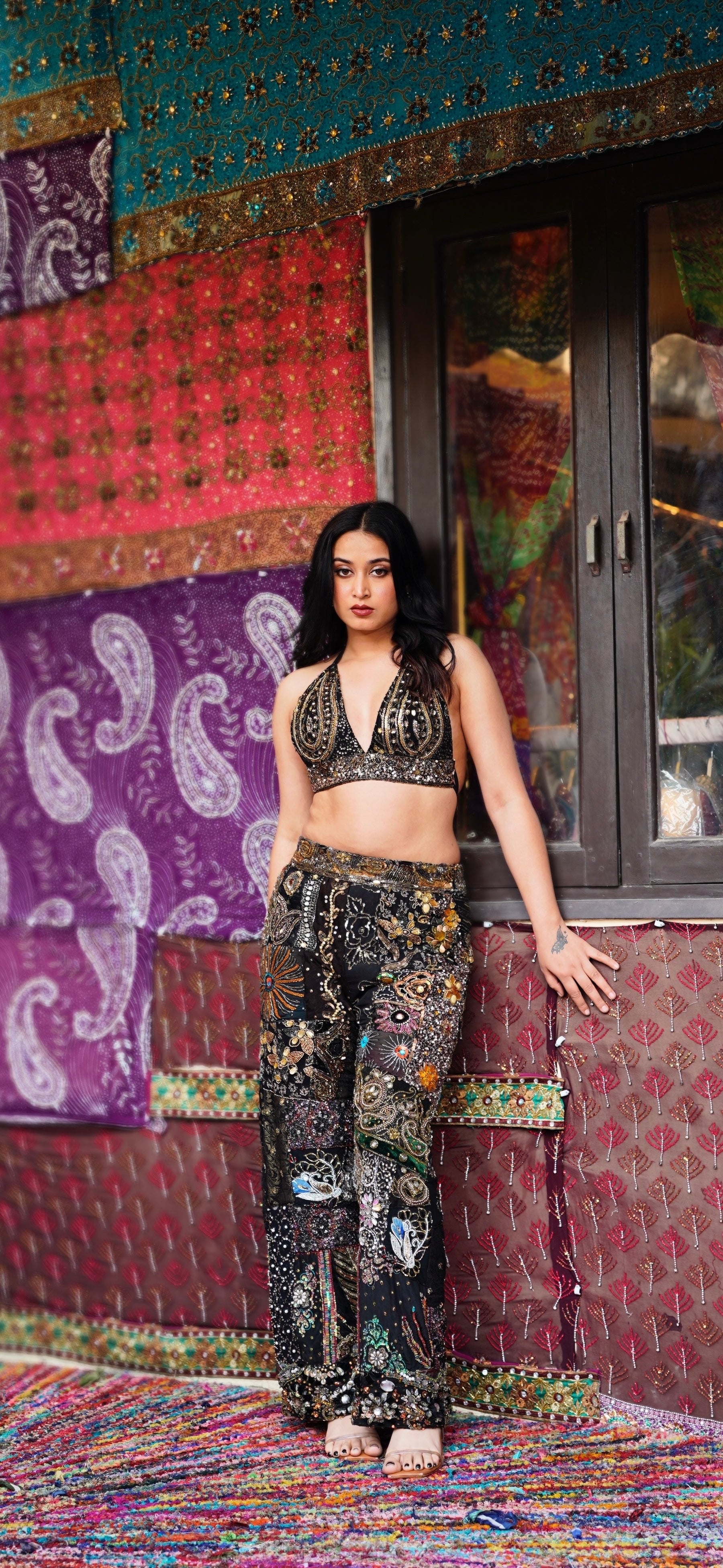 The Aarzoo Embellished Set is a fully hand-embroidered patchwork ensemble designed to blur the line between heirloom craftsmanship and modern sensuality. Featuring a bralette-style top paired with fluid embellished pants, this set is unapologetically bold yet meticulously refined.