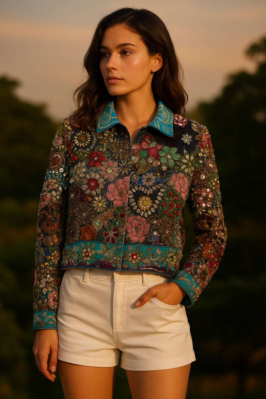 Add a touch of artisanal charm to your wardrobe with this Blue Denim Hand-Embroidered Boho Jacket. A true statement piece, it blends the rugged appeal of denim with intricate multicolor embroidery and mirror embellishments. Perfect for festivals, evenings, or casual outings, this jacket celebrates bohemian elegance with a modern twist.