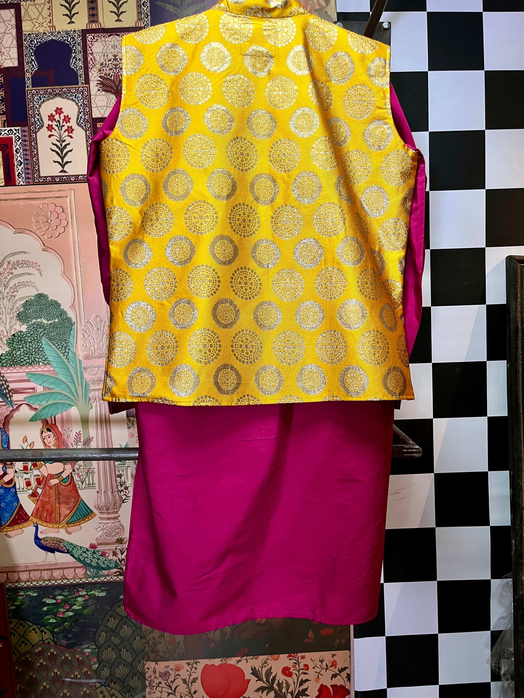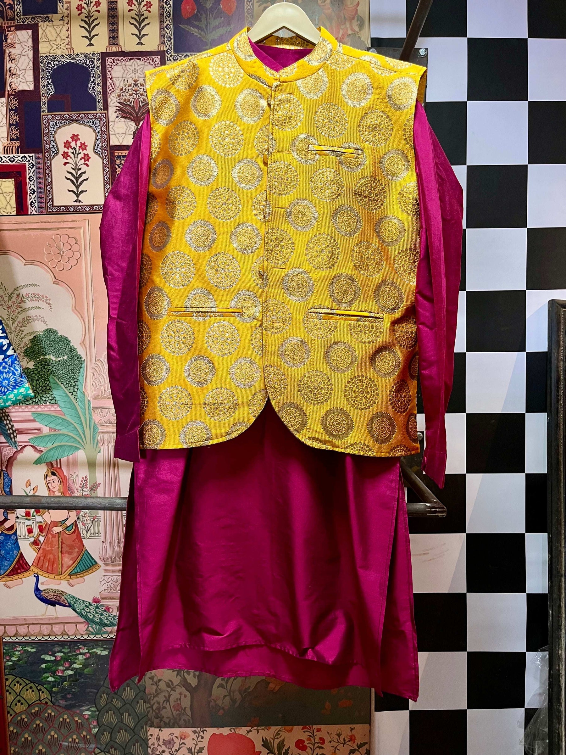 nehru jacket kurta set, golden brocade jacket, festive menswear, Indian wedding outfit men, groom outfit, men’s kurta jacket combo, ethnic wear for men, mandarin collar jacket, fuchsia pink kurta