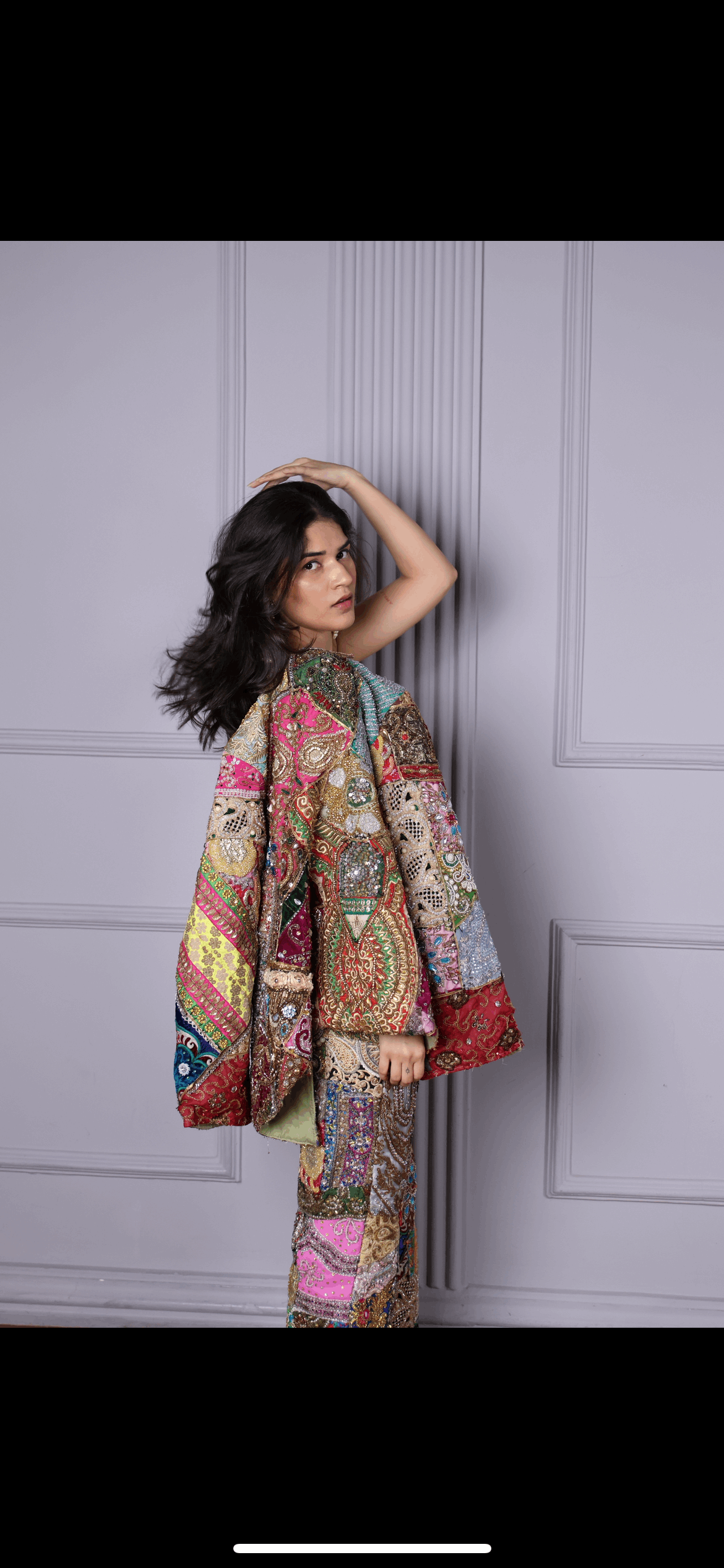 ✨ Statement Jacket: Oversized patchwork jacket with intricate embroidery, mirror work, sequins, and bead embellishments – a wearable canvas of artisan craftsmanship.