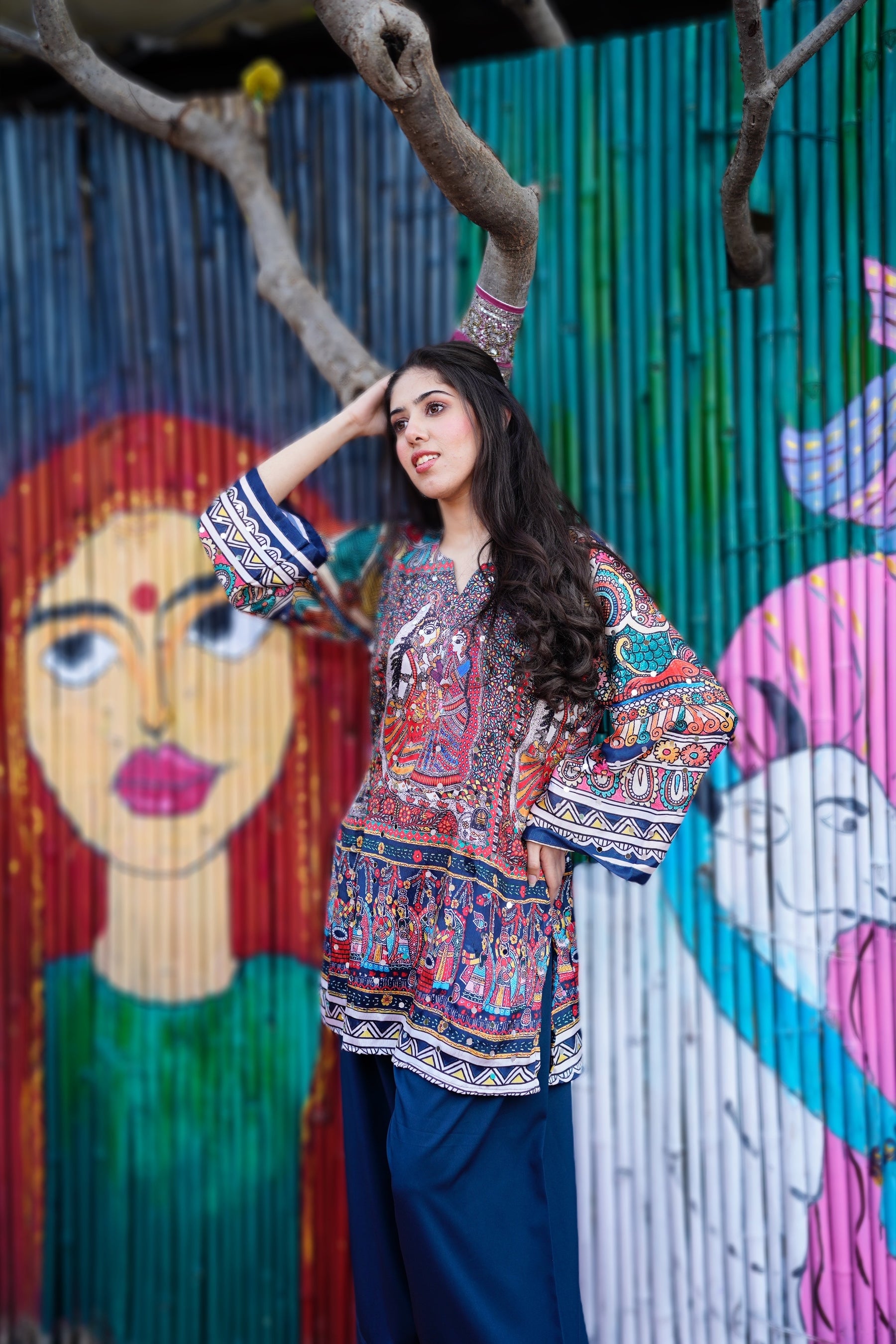 Crafted in soft crepe, the kurta features an abstract Madhubani print brought to life with hand-placed glass mirror embellishments. Paired with a classic farshi salwar, the set balances heritage artistry with modern ease — expressive yet composed, bold yet refined.