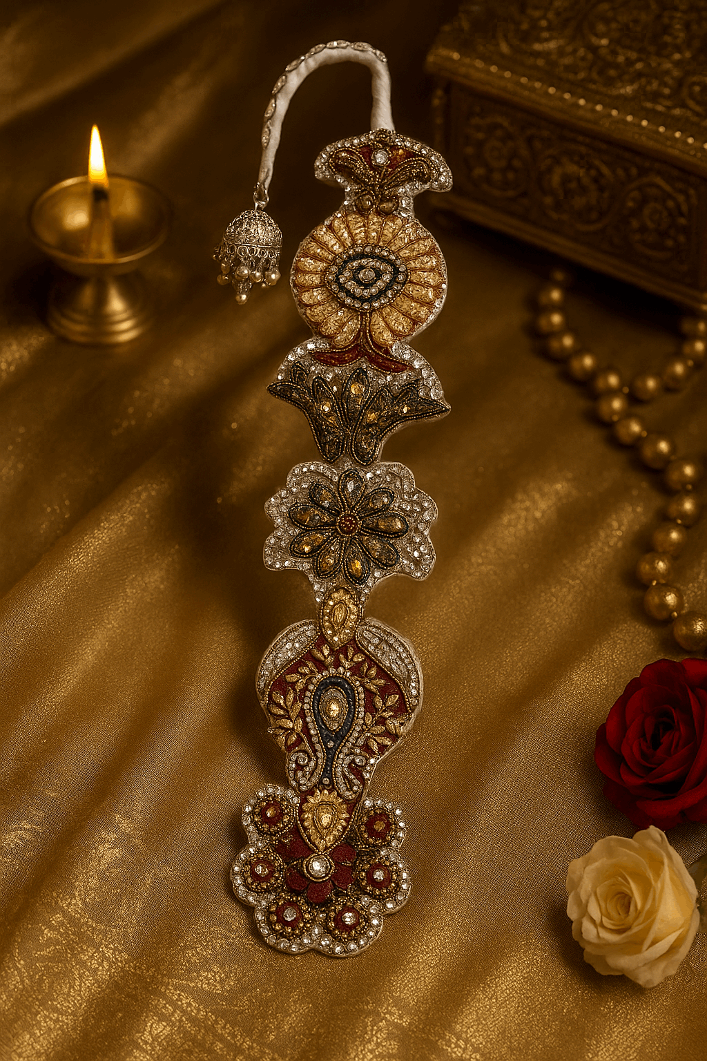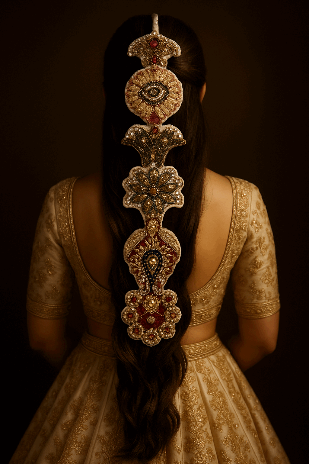 Elevate your bridal look with this luxurious handcrafted hair accessory, designed to gracefully adorn your braid or open tresses. Intricately detailed with zardozi embroidery, kundan stones, pearls, and mirror embellishments, it radiates a regal charm that blends tradition with modern bridal aesthetics.