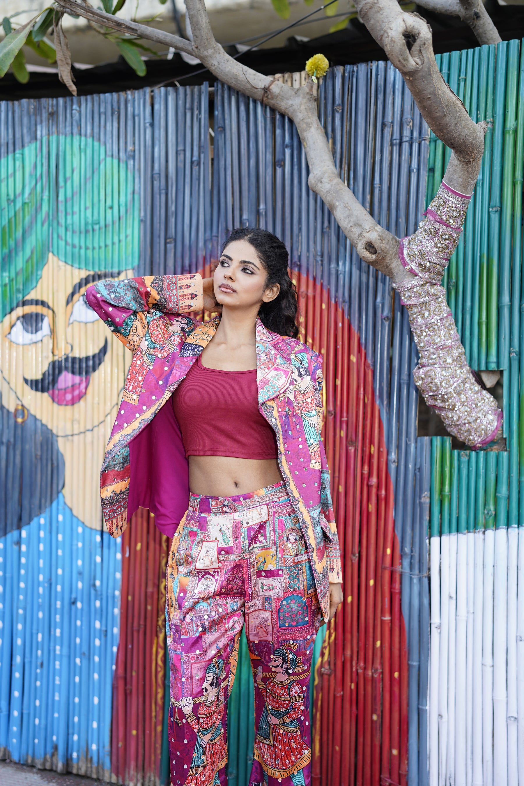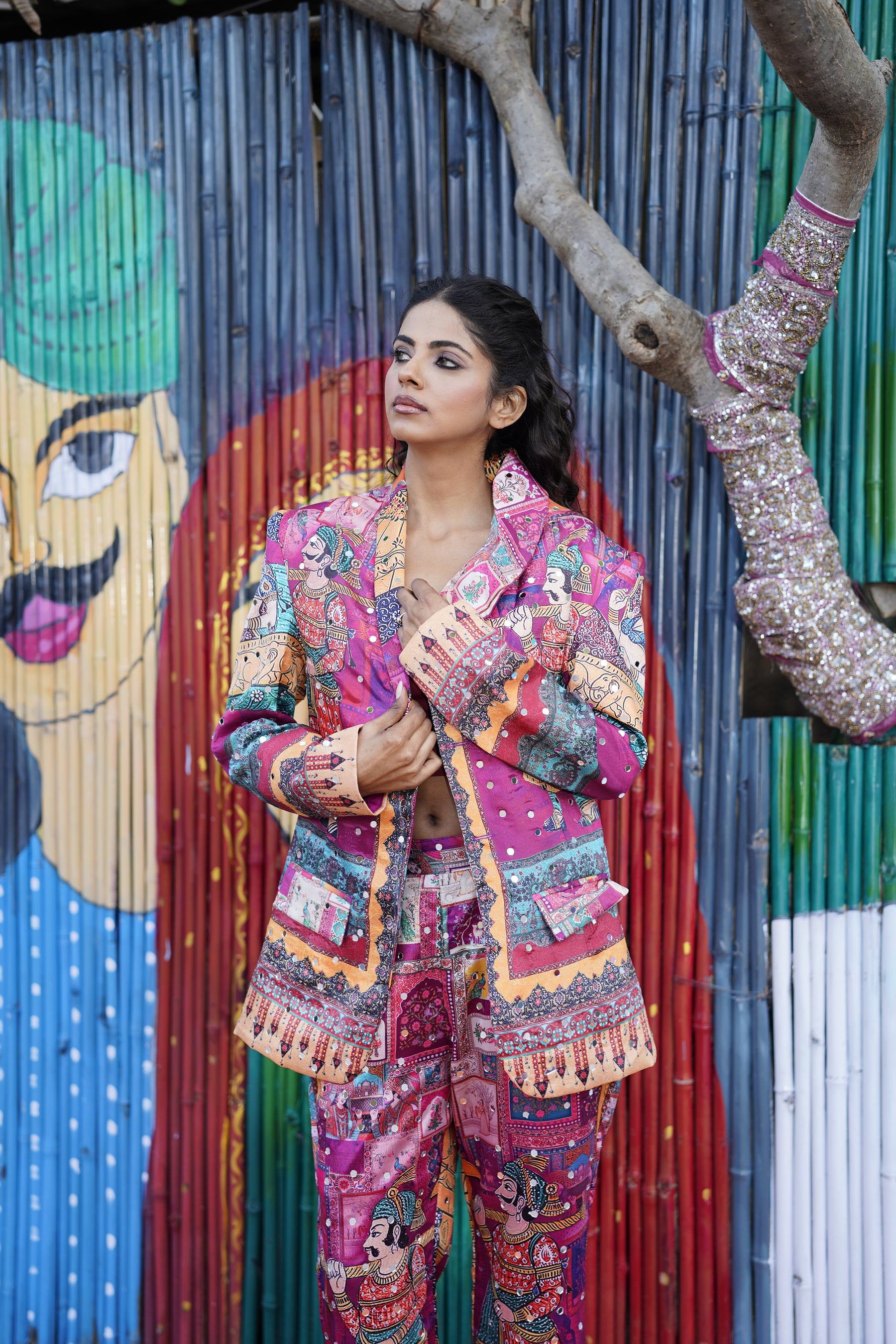 The Rajkahani Pant Suit is crafted in fluid crepe and brought to life with rich ethnic Indian prints—each panel echoing a visual narrative rooted in tradition yet styled for the contemporary woman.
