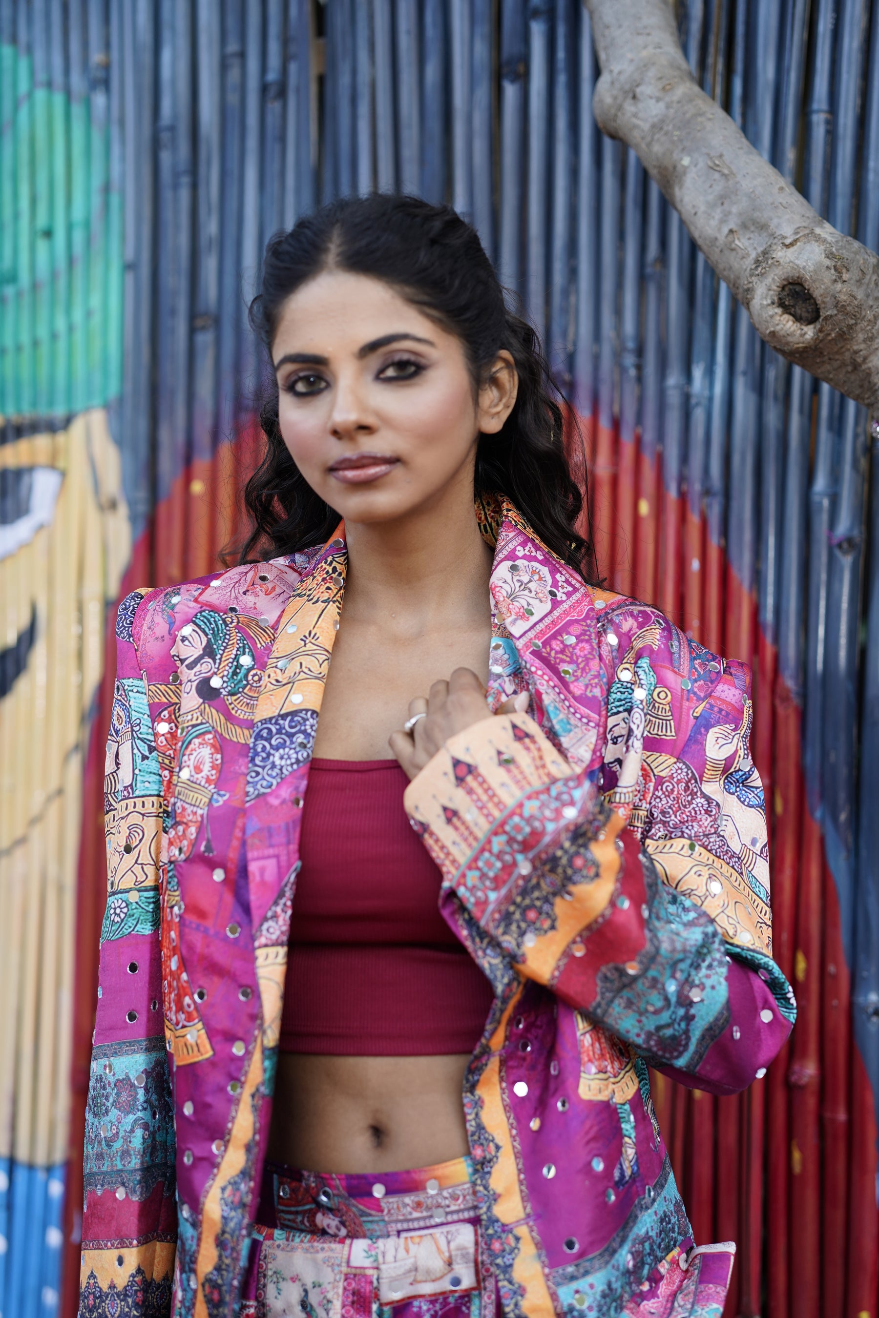 The structured blazer and tailored pants are elevated with real mirrors, meticulously hand-glued, adding subtle movement and light without overpowering the artistry of the print. Fully lined for comfort and fall, this set balances statement dressing with effortless wearability.
