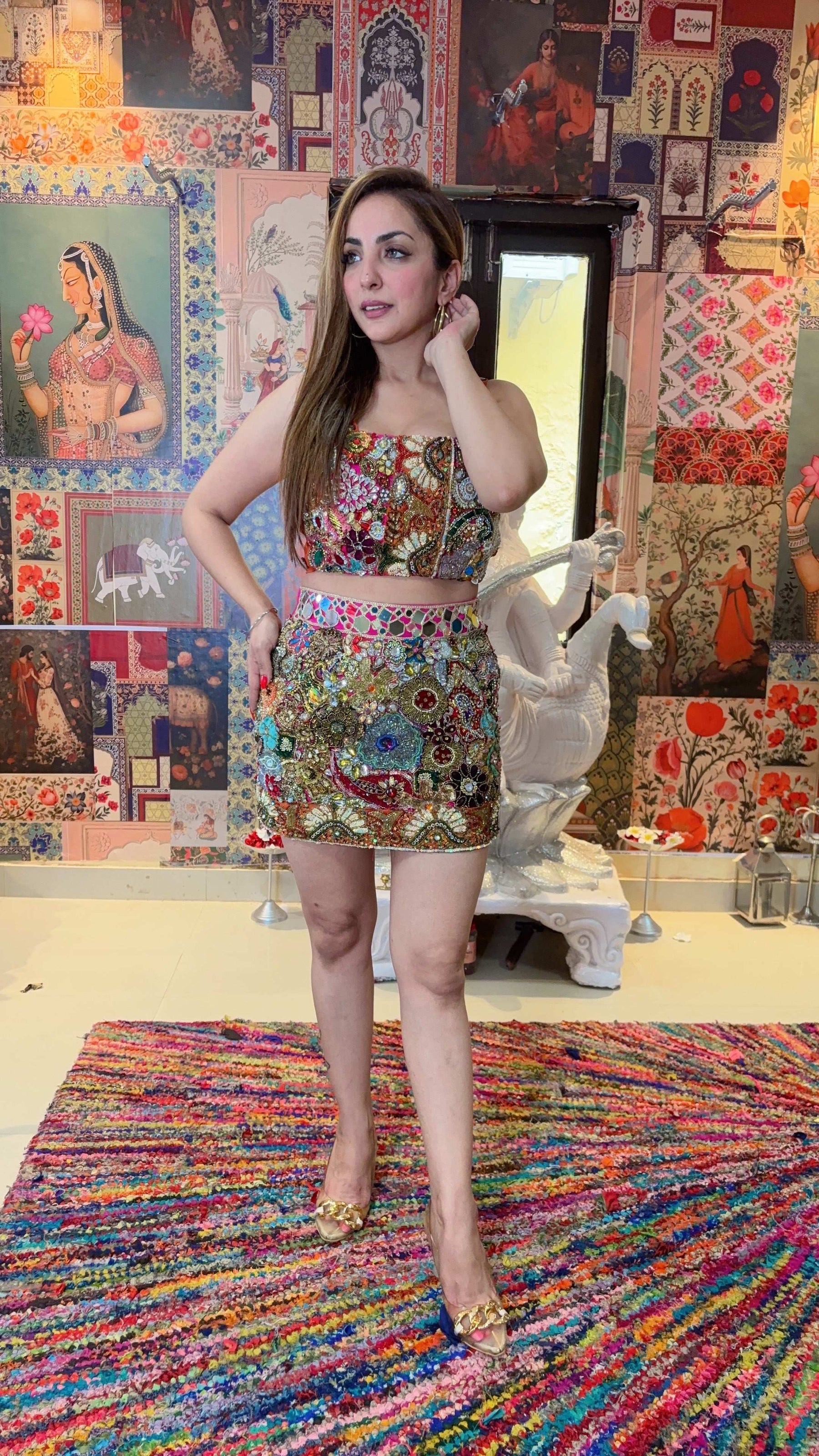 Turn heads with this dazzling handcrafted bustier and mini skirt set, intricately embellished with multicolor mirror work, sequins, and bead embroidery. The vibrant detailing paired with the chic silhouette makes this ensemble a bold fusion of traditional artistry and modern style — perfect for parties, weddings, or festive celebrations.