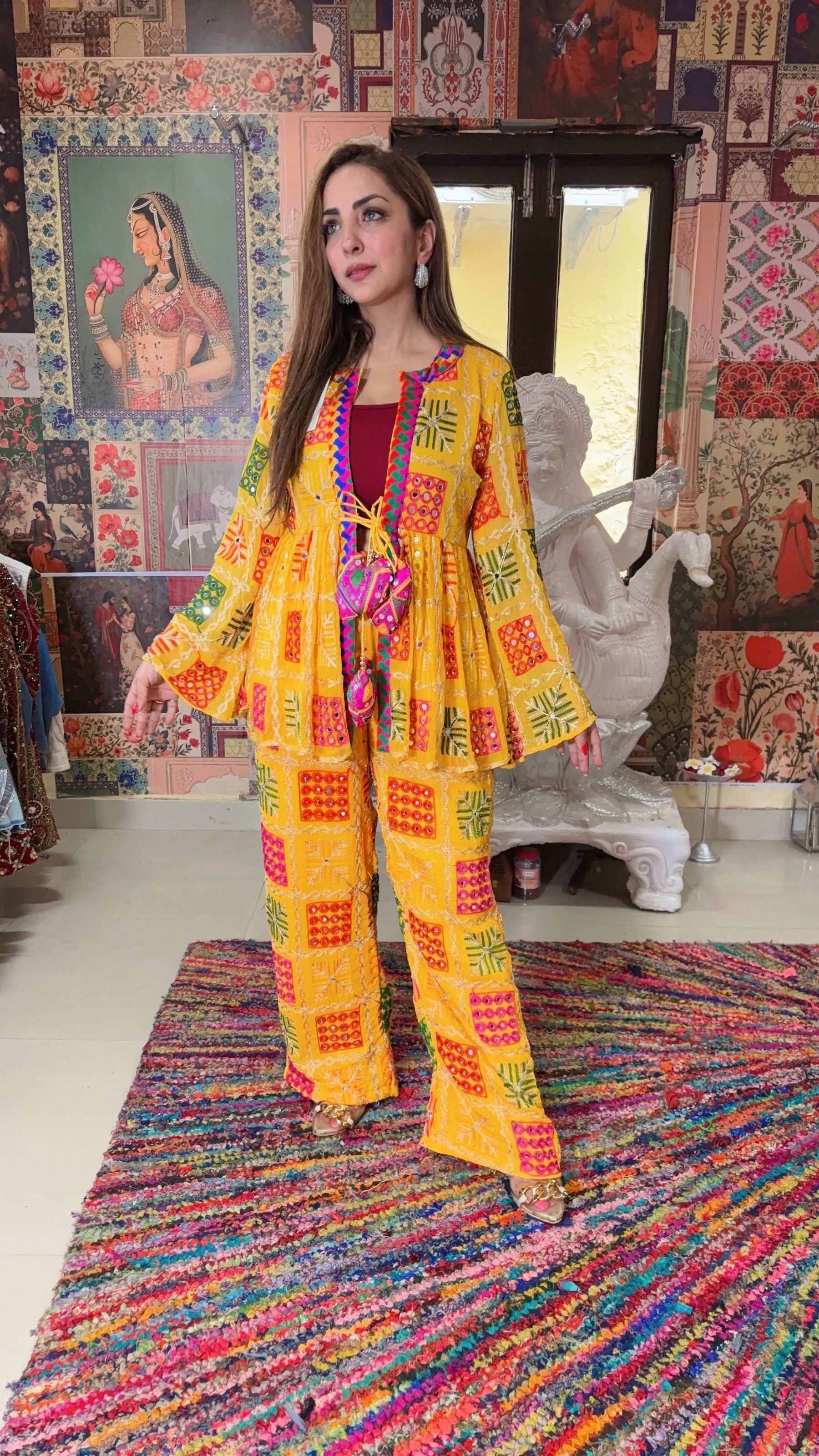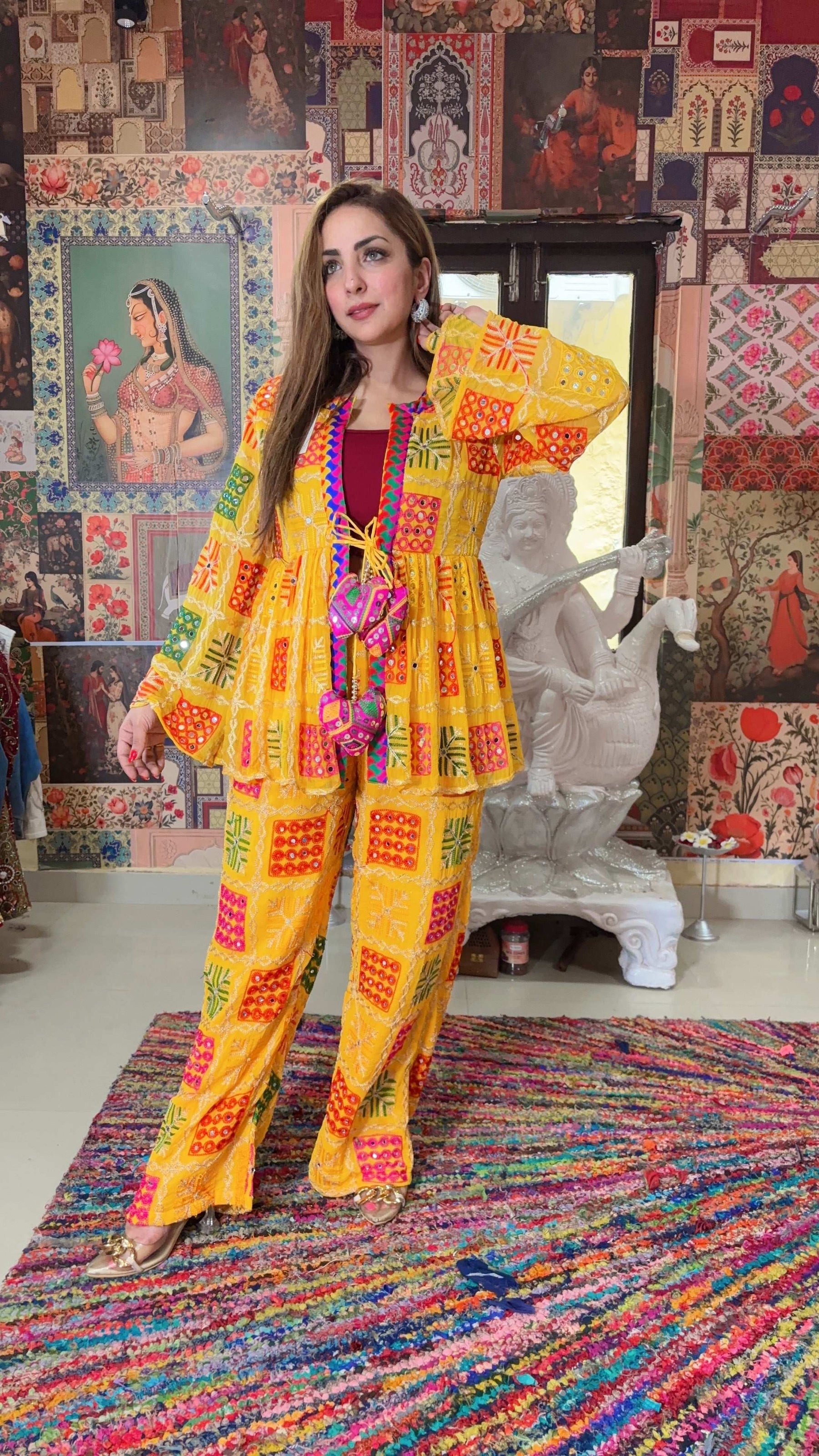 Bright, bold, and full of festive energy — this handcrafted sunny yellow co-ord set is a statement piece for the modern boho soul. Adorned with colorful hand embroidery, mirror work, and patchwork detailing, the set features a flared jacket with playful pom-pom tie-up and matching relaxed-fit pants. Perfect for festive occasions, haldi ceremonies, or destination celebrations where tradition meets fun.