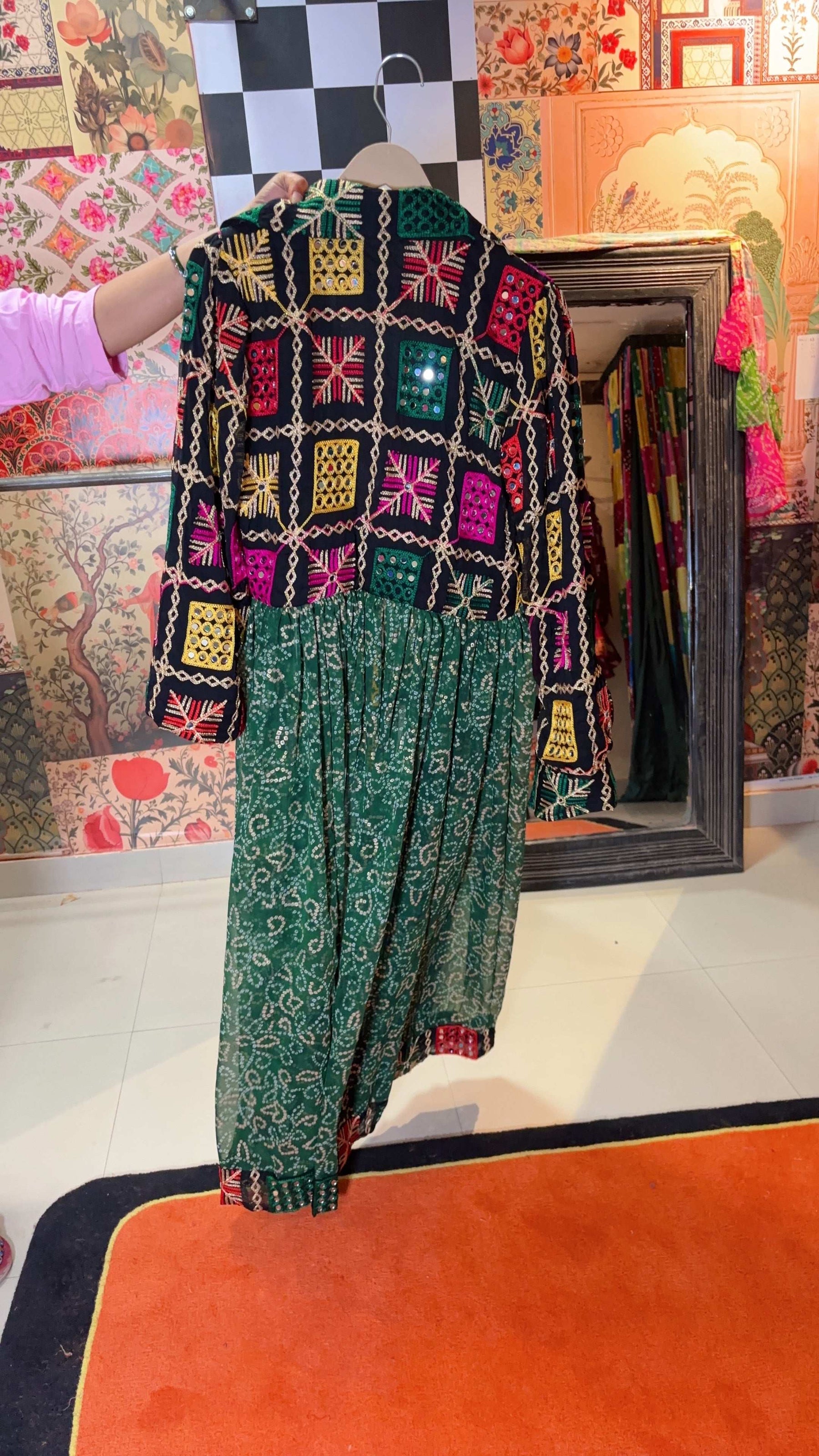 Emerald Green – With rich multicolor Phulkari yoke and swirling Bandhani patterns