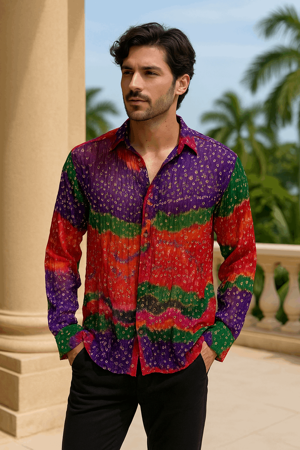 Stand out in effortless style with this vibrant multicolor Bandhani print shirt for men, crafted in lightweight crinkled cotton. Featuring rich hues of purple, red, green, and black, this shirt combines traditional Indian tie-dye artistry with a contemporary silhouette. Designed for breathability and bold expression, it’s perfect for tropical vacations, beach parties, or festive evenings. Button it up for a sharp look or leave it open over a tee for relaxed charm.