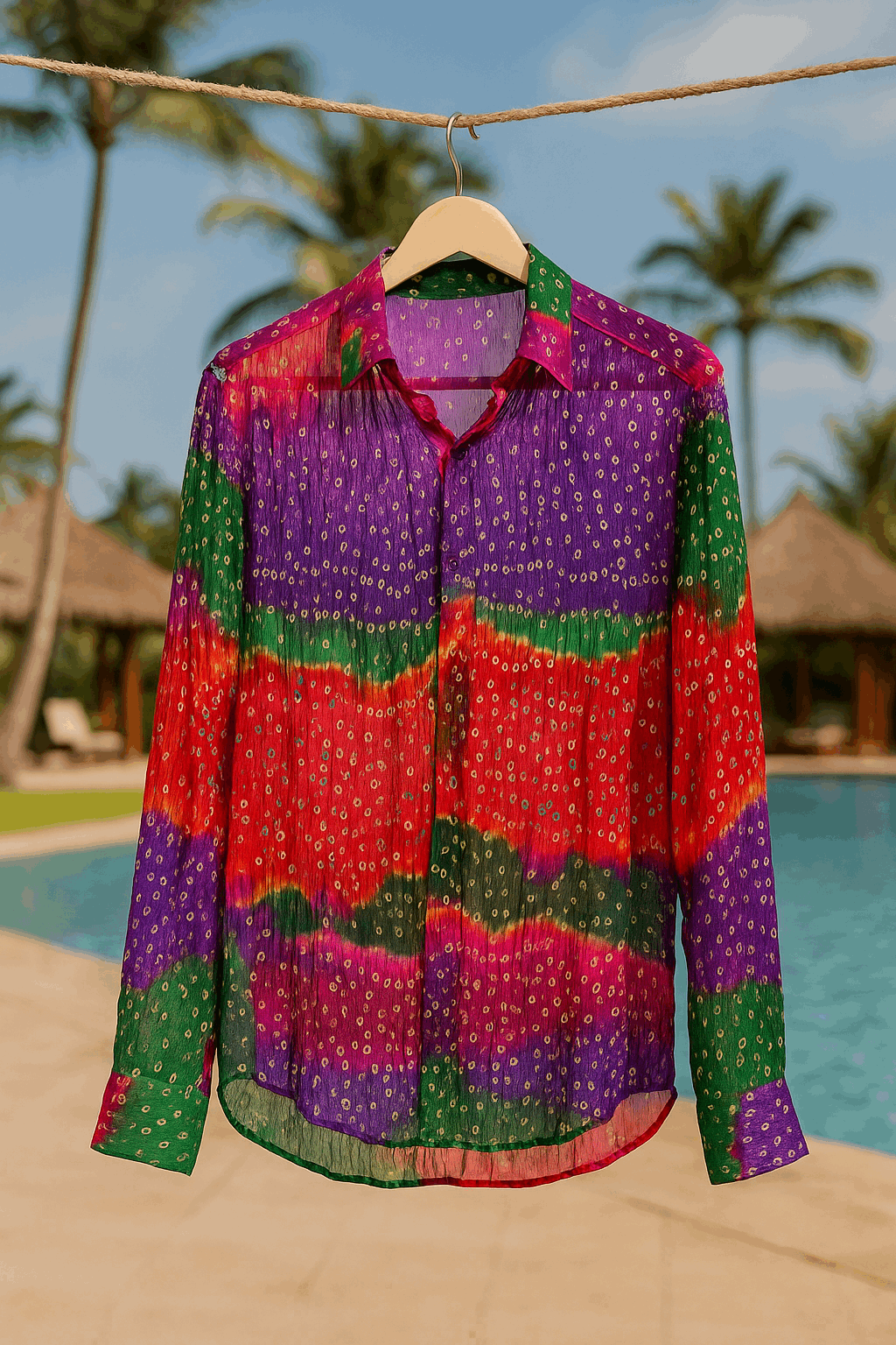 bandhani shirt, men’s boho shirt, multicolor cotton shirt, crinkled shirt, ethnic shirts for men, Indo fusion menswear, banjara shirt, beachwear shirt men, festive shirt