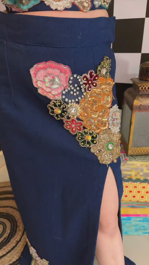 Embellished Bustier & Slit Skirt Set, a stunning fusion of contemporary silhouette and intricate handwork. The cropped bustier is richly adorned with multicolored embroidery, sequins, beads, and mirror work, creating a statement piece full of artisanal detail. Paired with a sleek navy skirt featuring heavy hand-embellished floral motifs and a bold side slit, this set exudes festive elegance and modern glam.