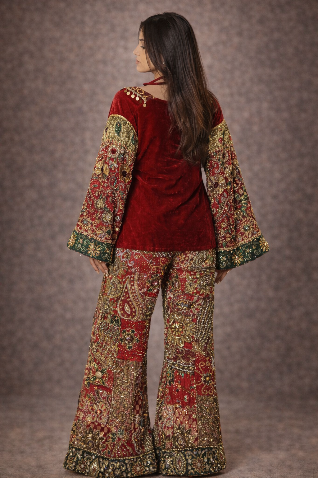 The set features a deep crimson velvet open-style kimono, intricately adorned with hand-stitched embroidery, metallic accents, and coin detailing, paired with matching heavily embellished patchwork palazzo pants. The richness of the velvet base is elevated through layered textures, traditional motifs, and jewel-toned highlights.
