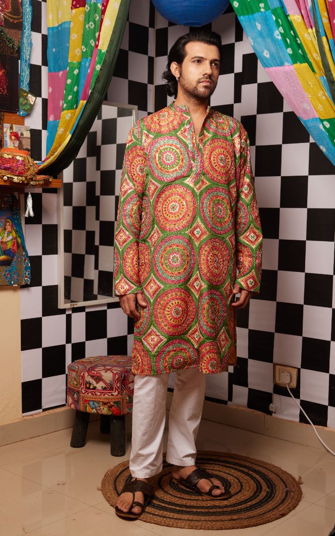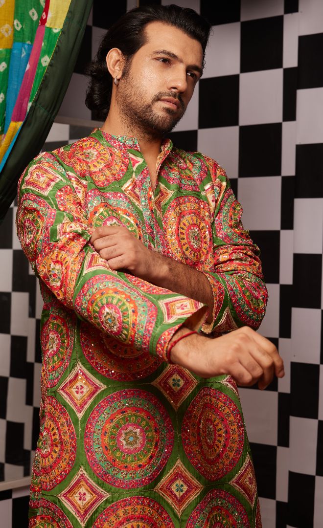 Featuring circular mandala-inspired embroidery and mirror inlay, this kurta blends intricate traditional motifs with a contemporary silhouette. The play of bold threads, metallic details, and artisanal precision make it a true statement piece for festive occasions and cultural celebrations.