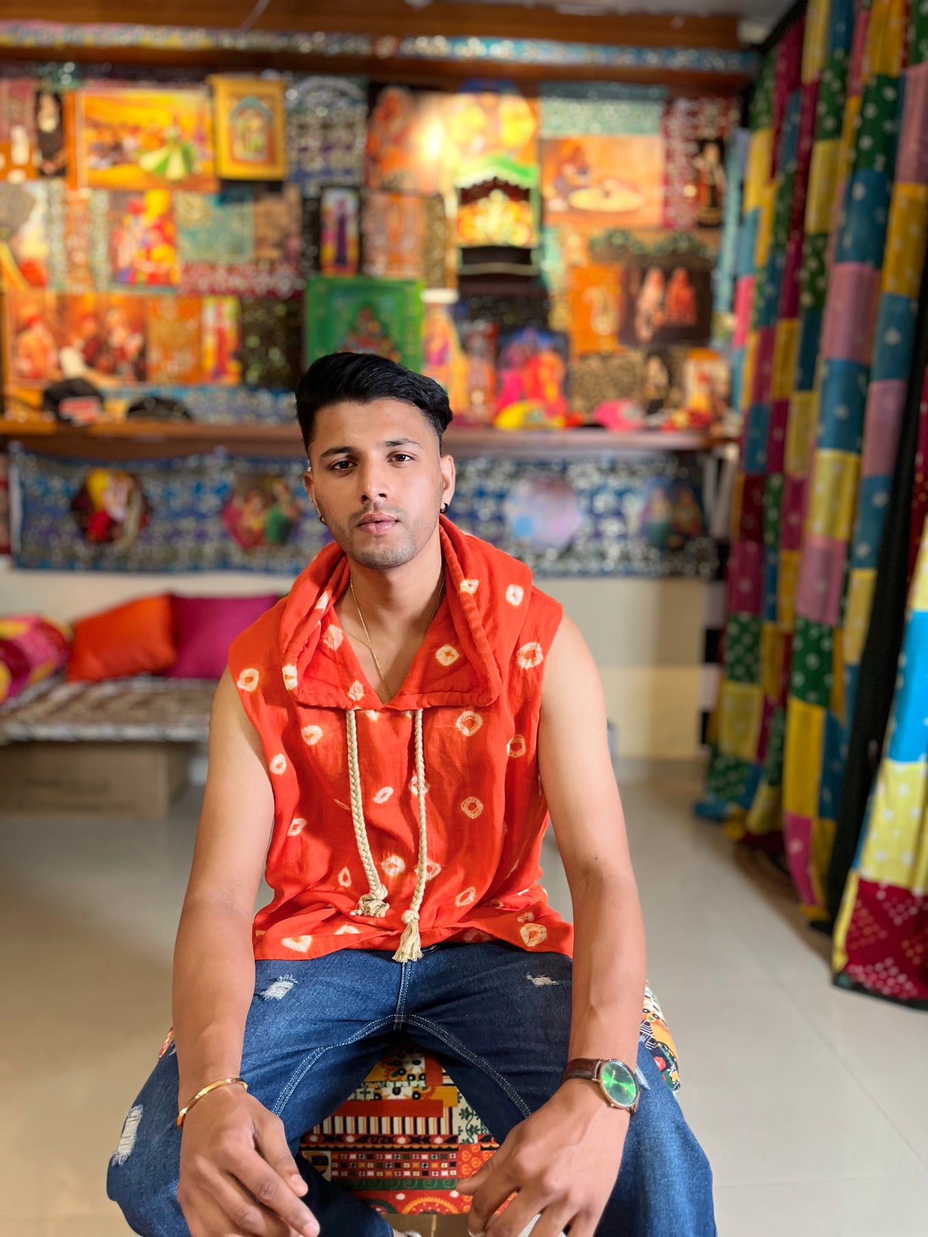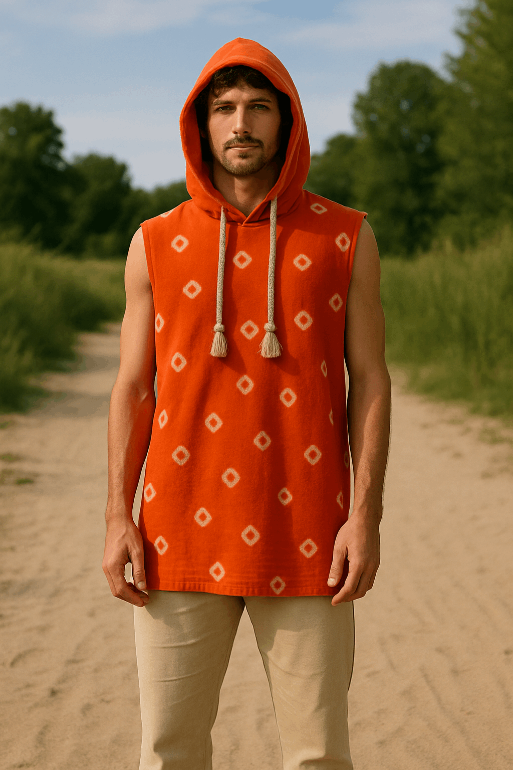 Men Orange Bandhani Sleeveless Shirt With Hood