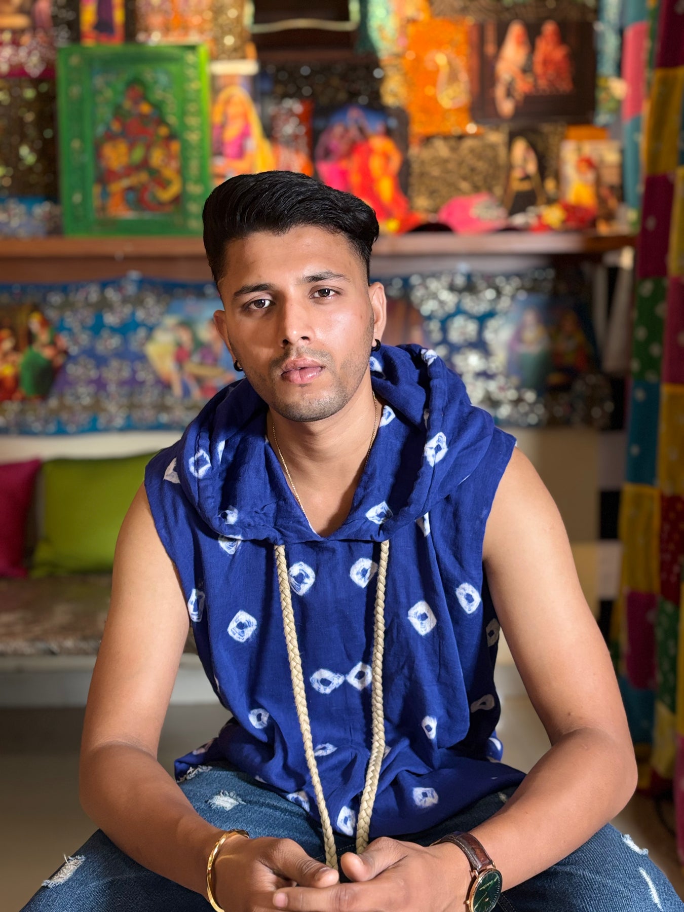 A bold twist on traditional craft, this sleeveless shirt hoodie in a fiery orange shade showcases the timeless Bandhani tie-dye technique. Lightweight, comfortable, and effortlessly stylish, it merges streetwear vibes with artisanal roots. Finished with a relaxed hood and rope drawstrings, this piece is designed for statement dressing.