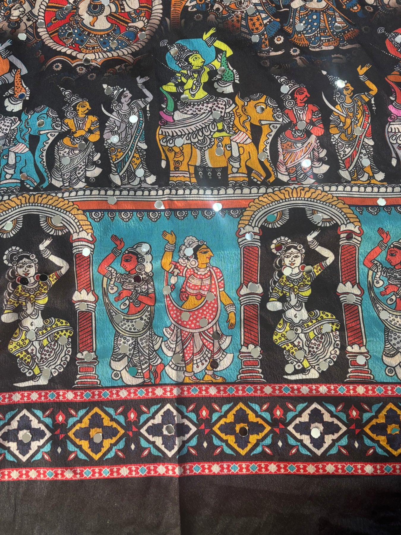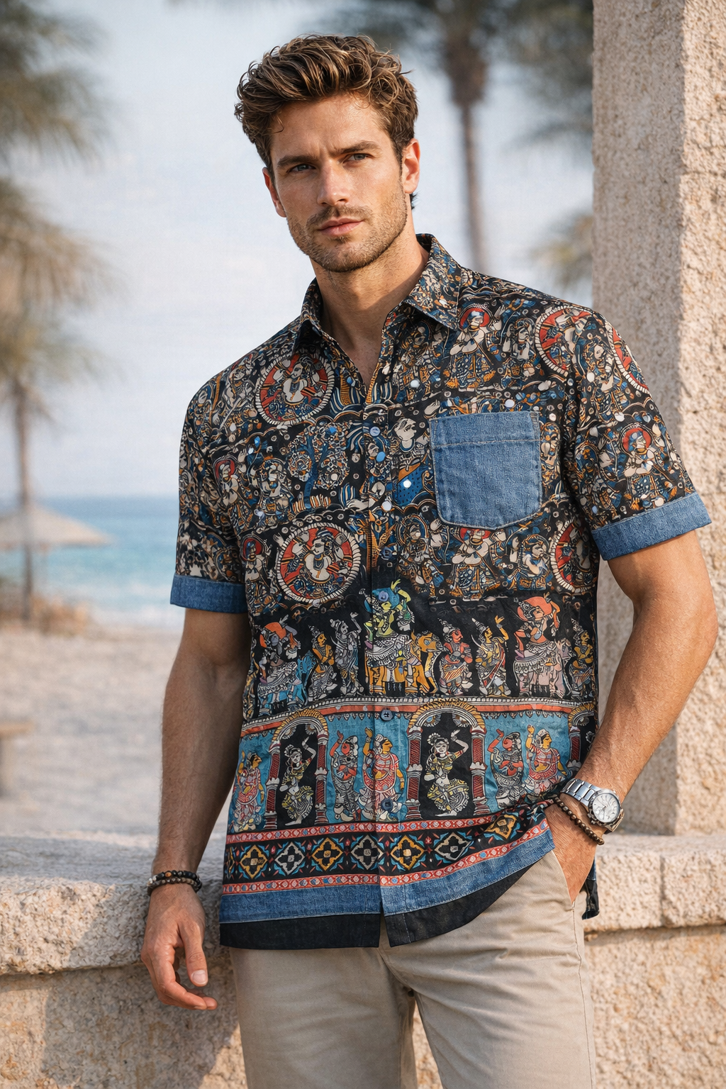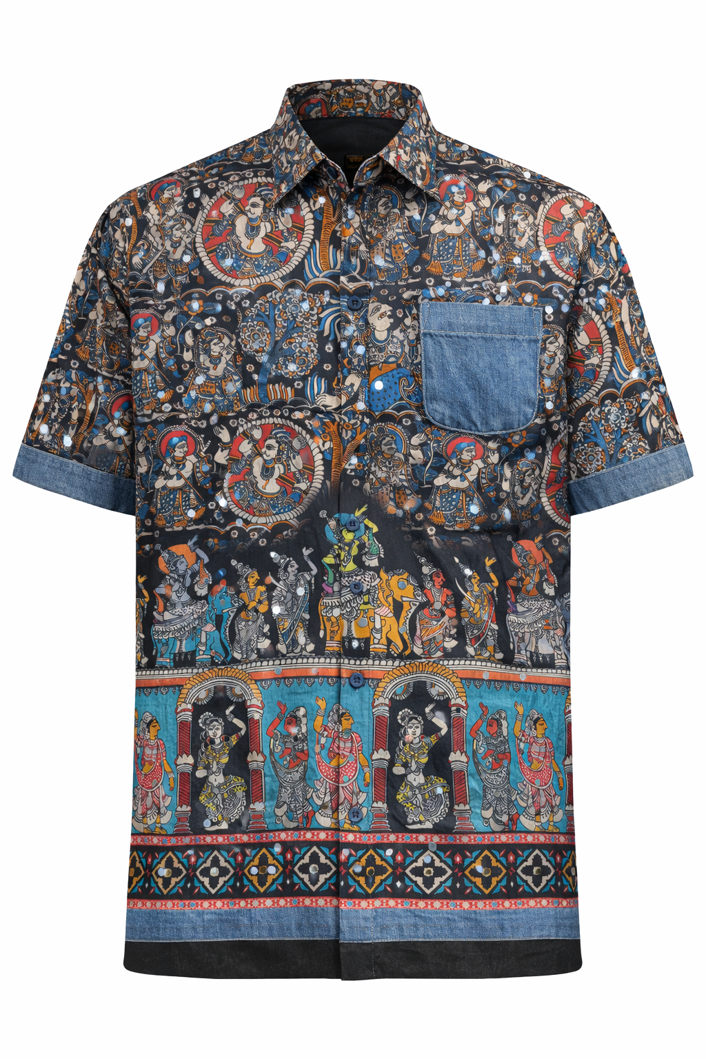 Crafted in fluid crepe and finished with real mirrors glued by hand, The Heritage Drift Shirt brings together centuries-old Kalamkari storytelling with contemporary menswear design. The intricate digital print narrates heritage motifs and movement, while subtle denim accents add a grounded, modern edge.