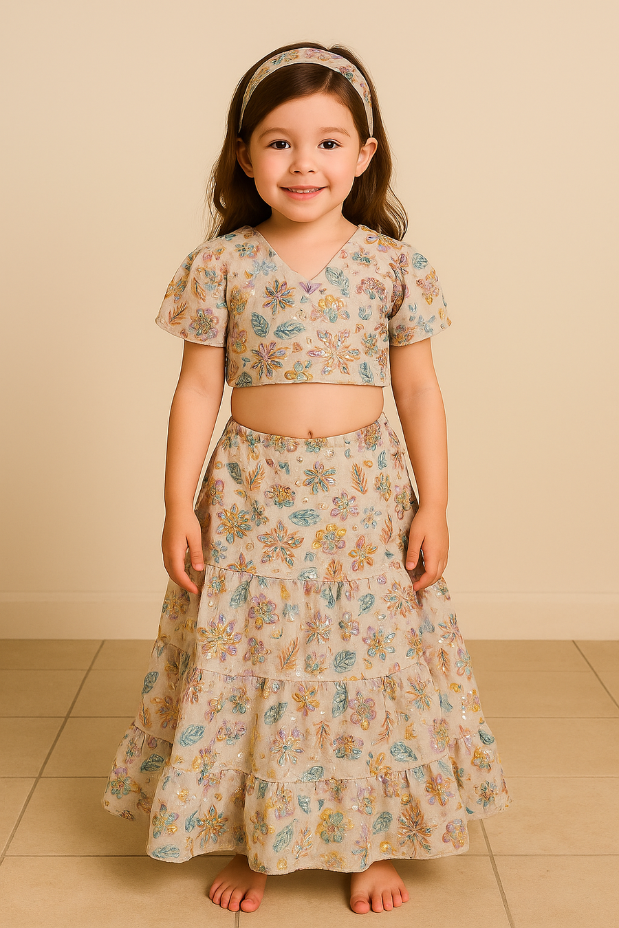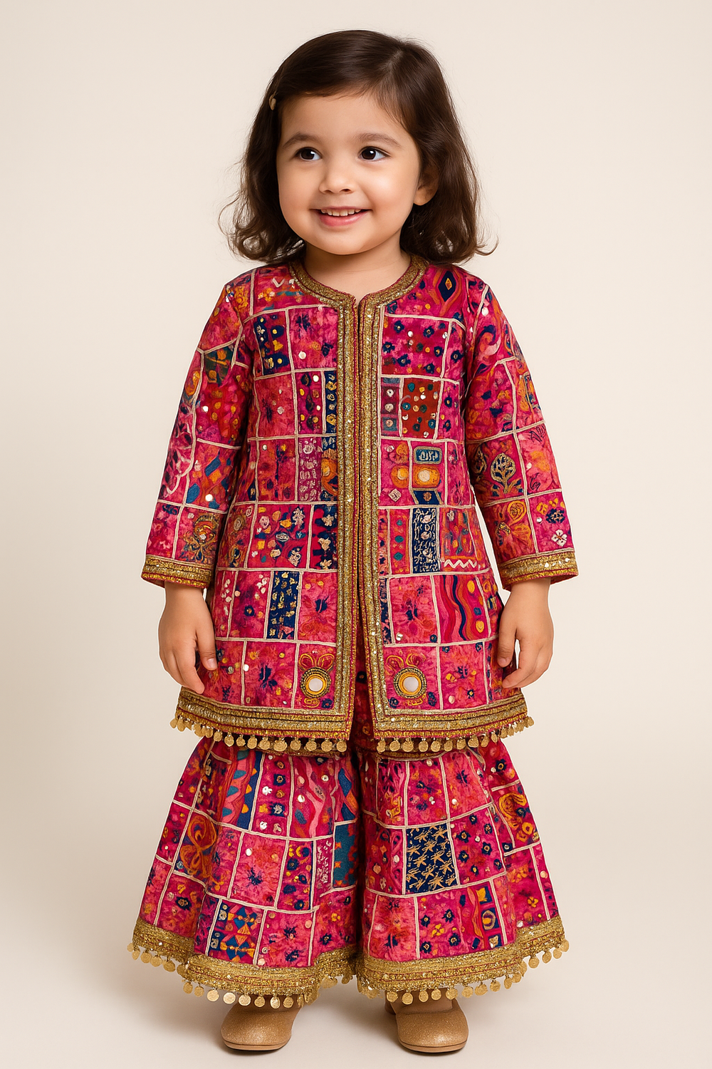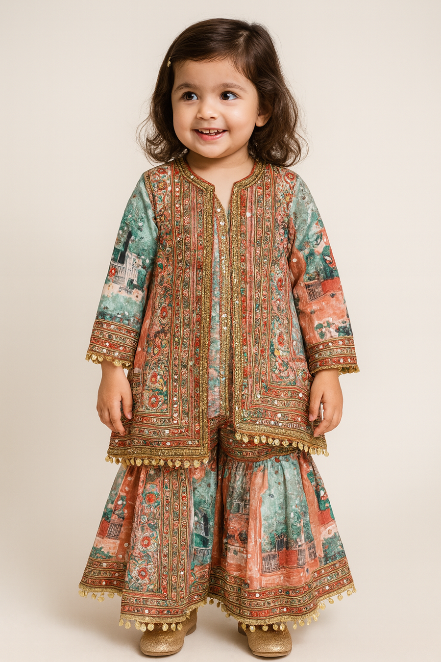 Mini Maharani Printed Jacket & Tiered Sharara Set