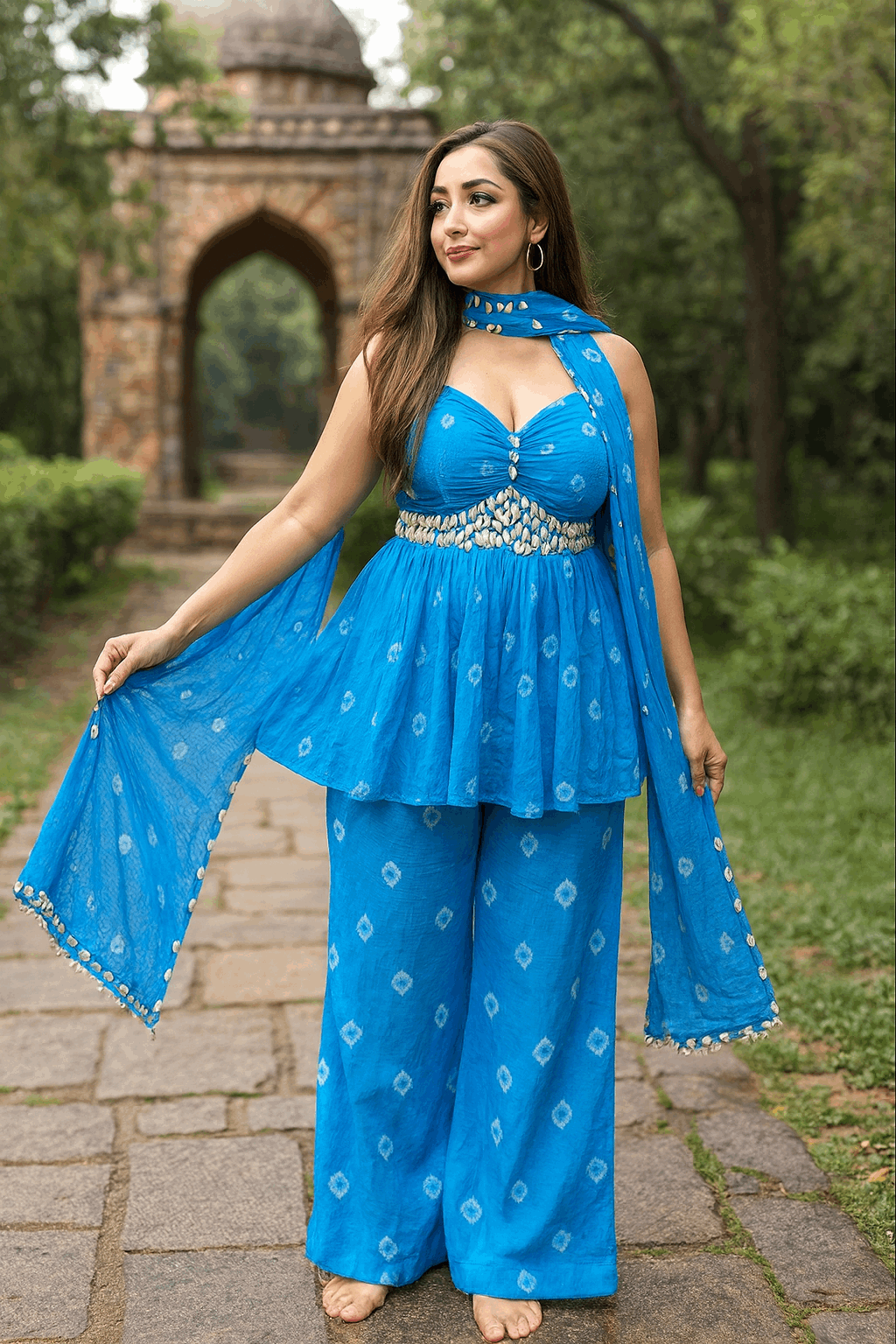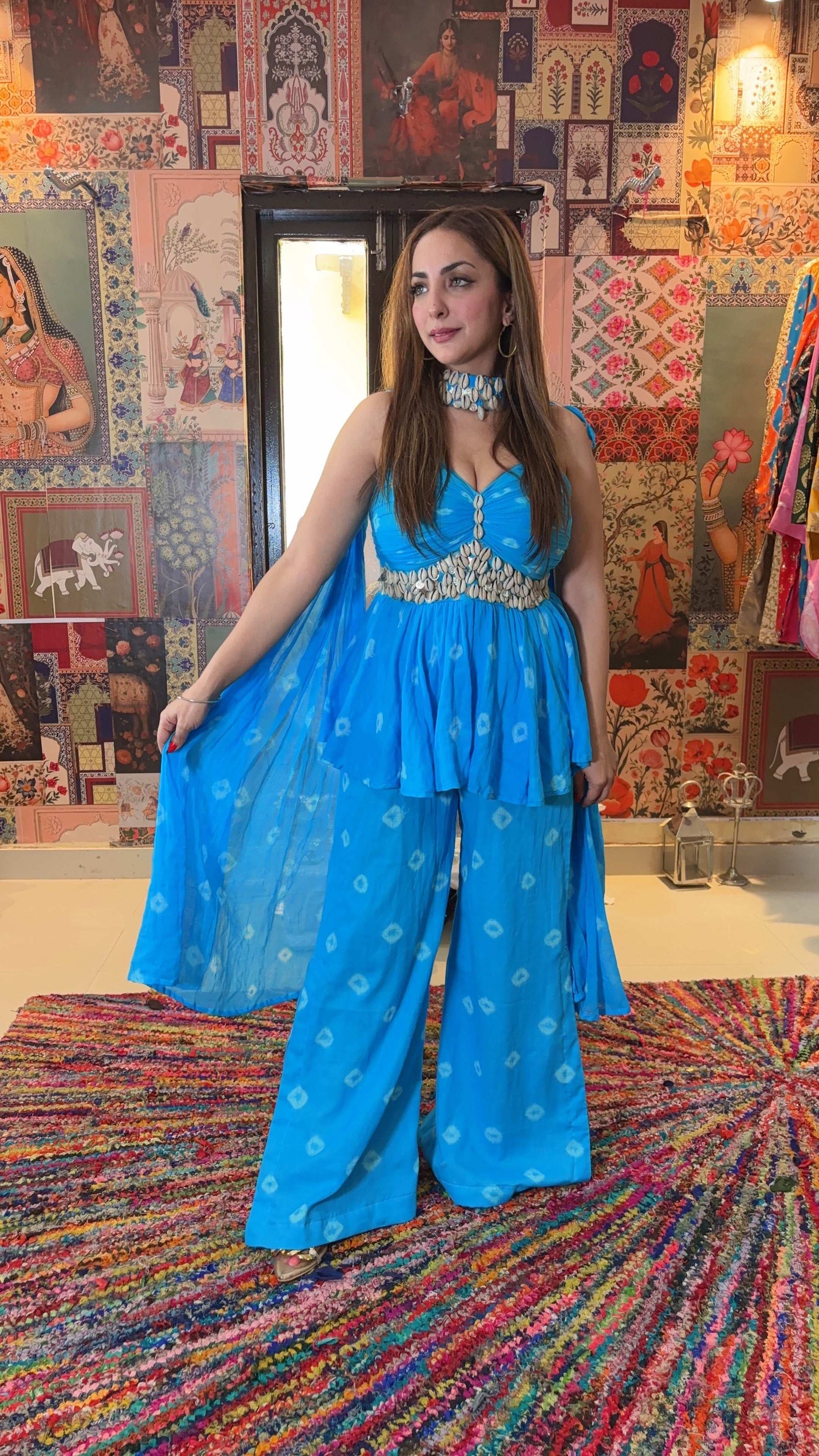 Step into effortless elegance with this handcrafted aqua blue co-ord set, blending boho charm with modern flair. The breezy silhouette features a flowy peplum top adorned with natural shell embellishments at the neckline and waist, paired with wide-leg bandhani pants. A sheer cape detail adds a dramatic touch, making it perfect for festive celebrations, weddings, or resort evenings.