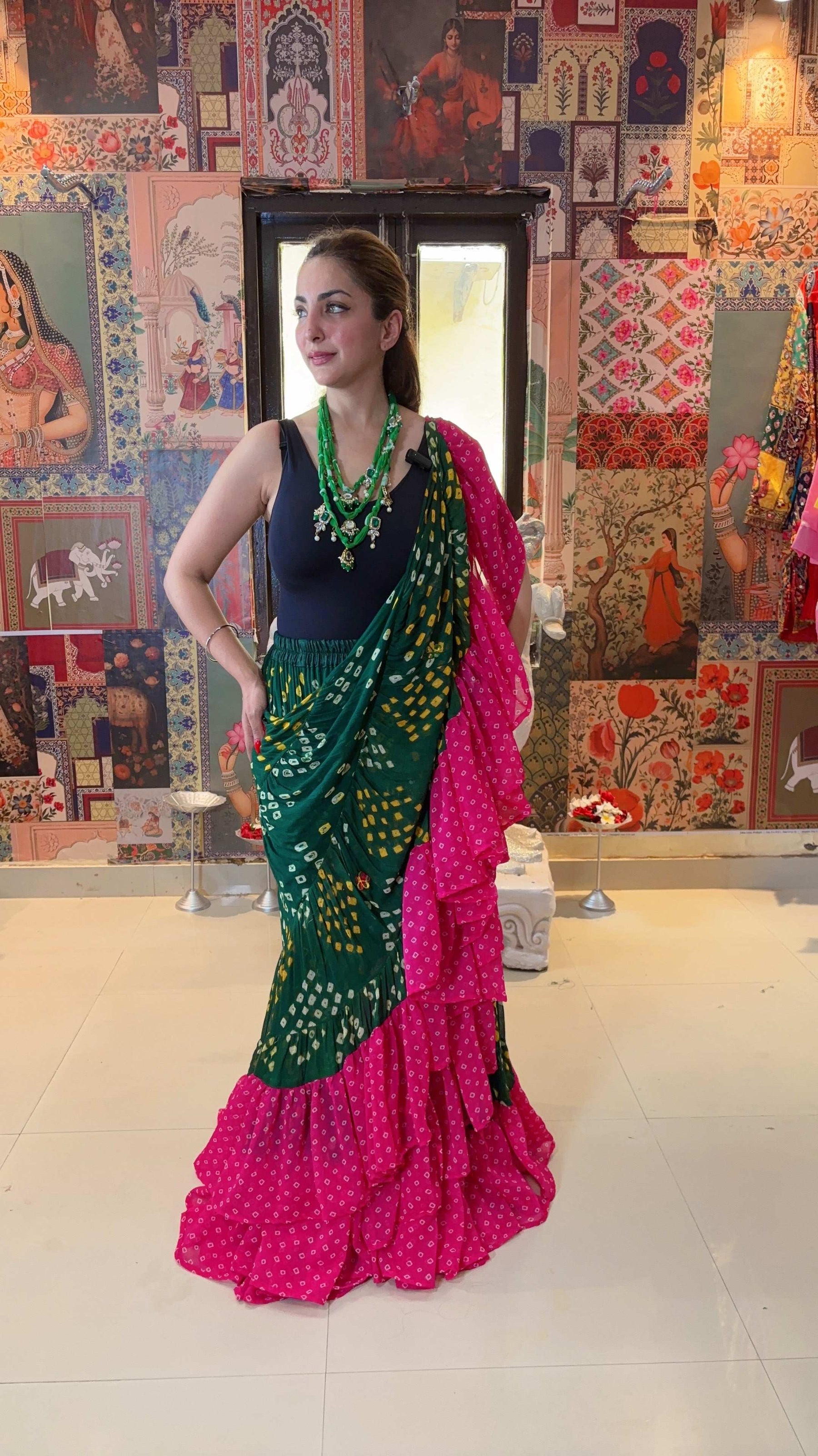 - Detailing: Traditional Bandhani dye with contrasting ruffle border