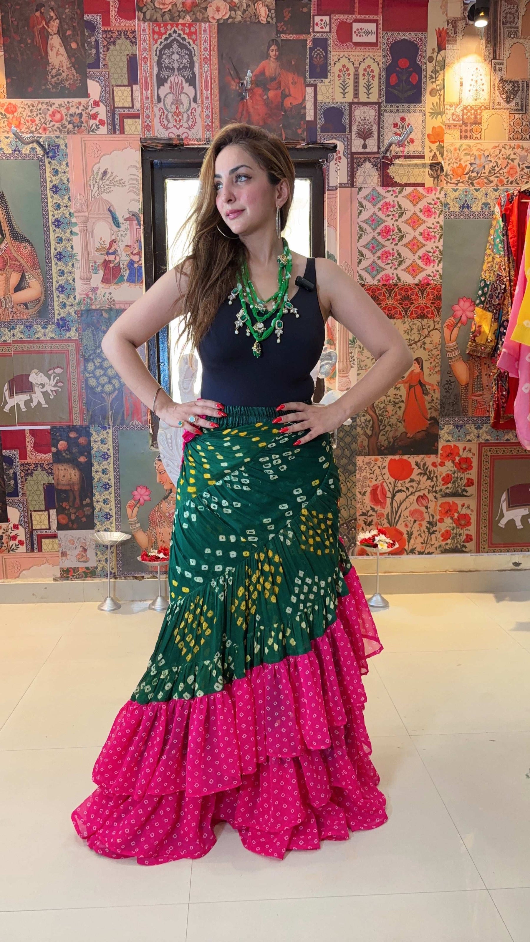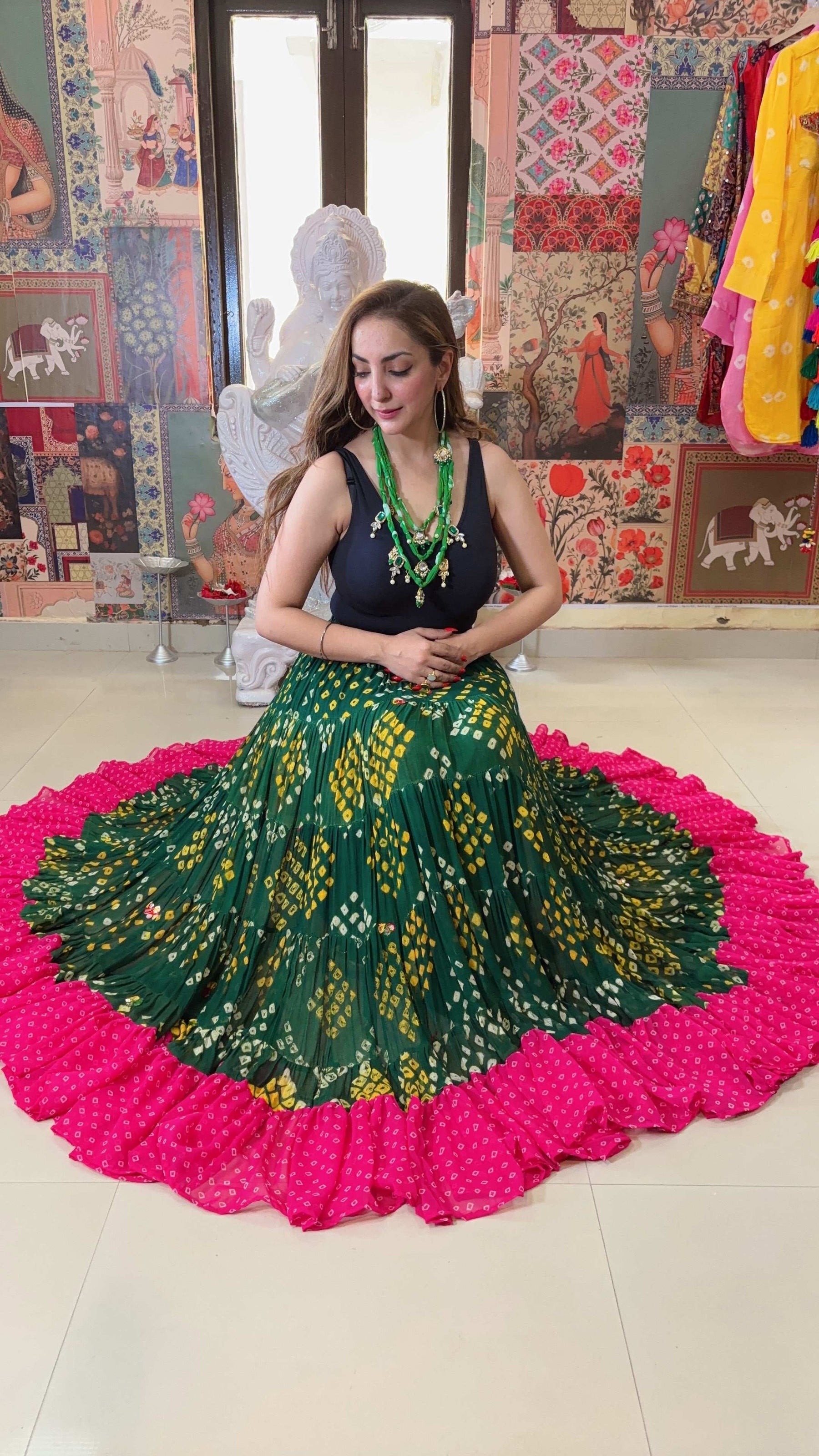 Make a grand twirl statement with this vibrant 20-meter flare Senirota skirt, hand-dyed in rich green Bandhani patterns and accentuated with a bold pink border. Crafted for comfort and volume, this piece is a true celebration of color, culture, and craftsmanship — perfect for Dandiya nights, festive occasions, and boho bridal wear.