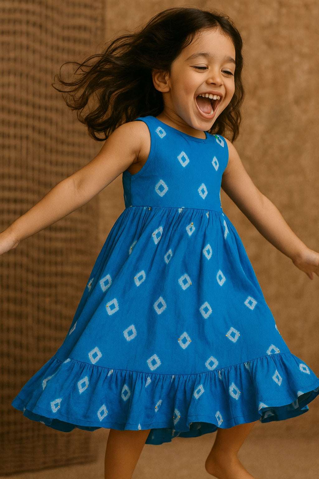 Let your little one twirl in style with our vibrant blue ikat print dress – a perfect blend of comfort and cuteness! Made from soft, breathable cotton, this sleeveless dress features a classic A-line silhouette with a gathered waist and flared hem. Whether it's for playdates, picnics, or special occasions, this dress is designed to move with her joy and energy.