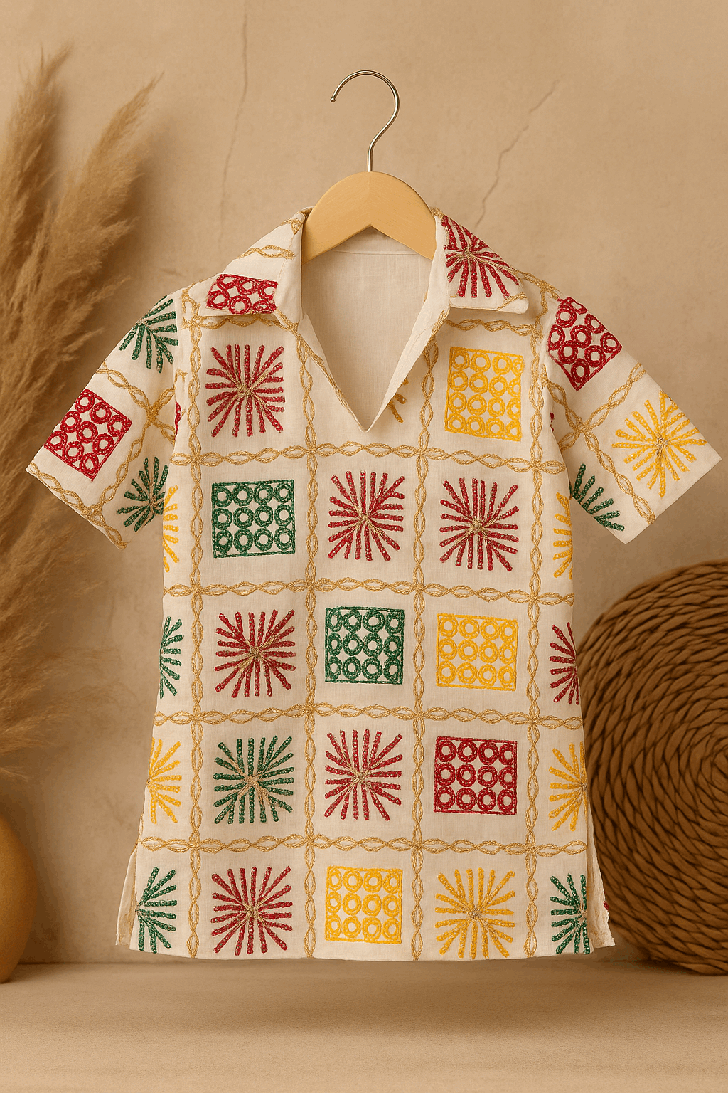 Let your little one shine bright in this cream-colored shirt featuring a vibrant embroidered grid pattern. Crafted from soft, breathable cotton, the shirt boasts short sleeves, a smart collar, and eye-catching thread embroidery in red, yellow, and green tones. Perfect for festive occasions or stylish summer days, this shirt adds a dash of tradition with a playful twist.