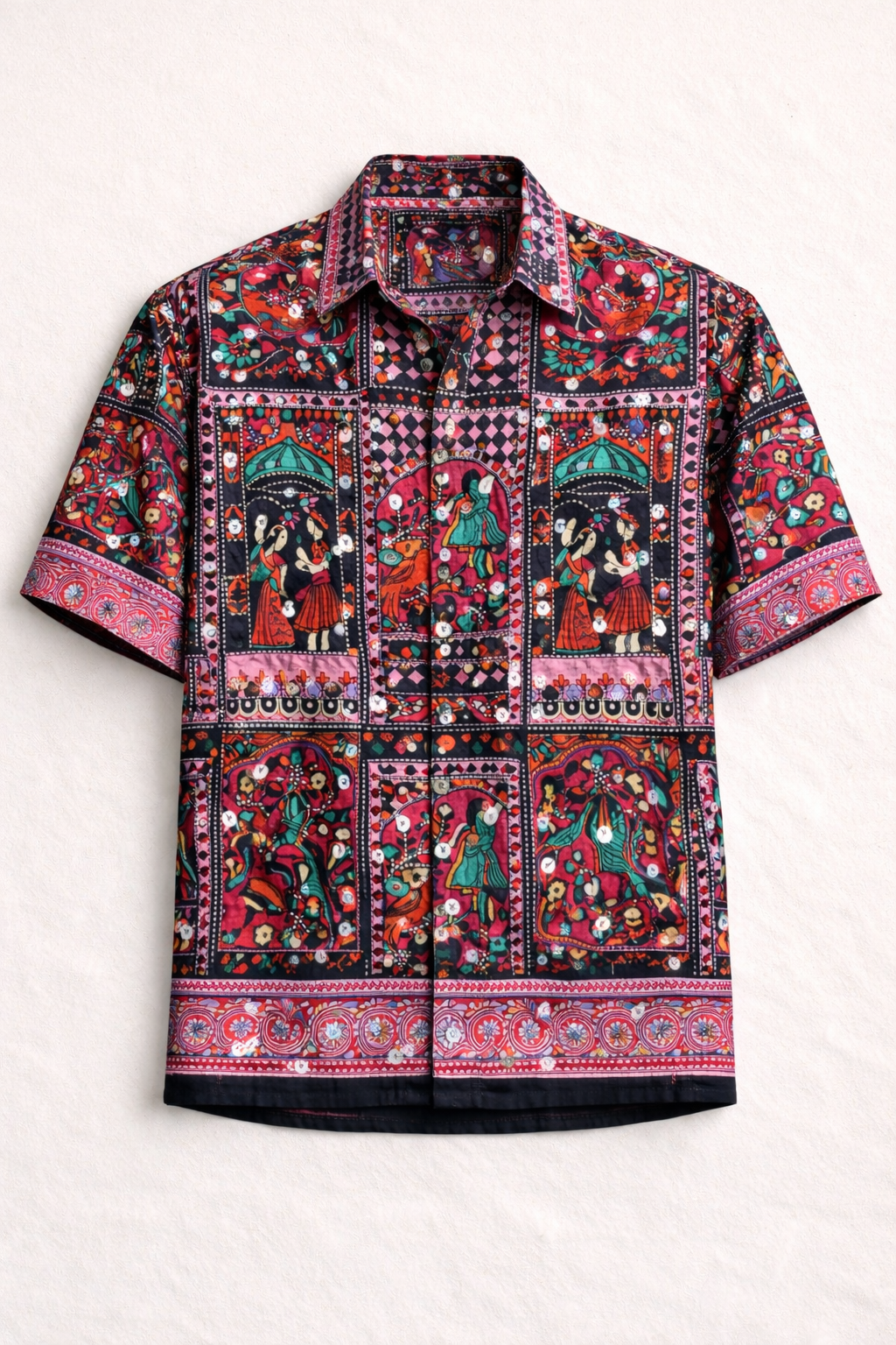 Crafted in fluid crepe, the Deccan Afterhours Shirt features an Indian abstract narrative print, elevated with hand-glued mirrors that catch light with every movement. The artwork draws from Deccan folk storytelling—reimagined through a contemporary, global lens.