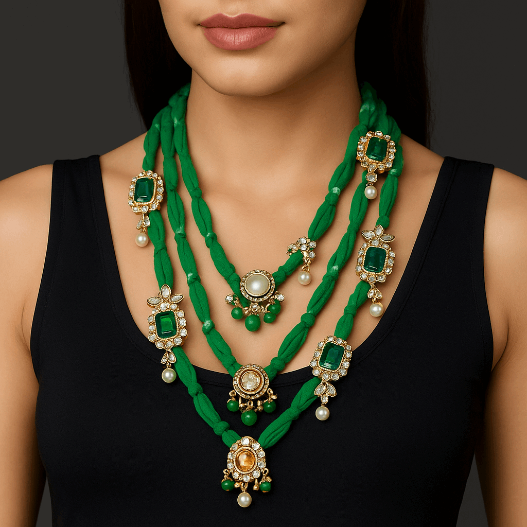 Add a touch of regal elegance to your look with our Emerald Royalty Kundan Pearl Necklace. Featuring hand-knotted deep green fabric strands adorned with classic kundan motifs, faux pearls, and emerald-hued stones, this statement piece blends tradition with modern flair. Perfect for festive occasions, weddings, or elevating your Indo-western fits.