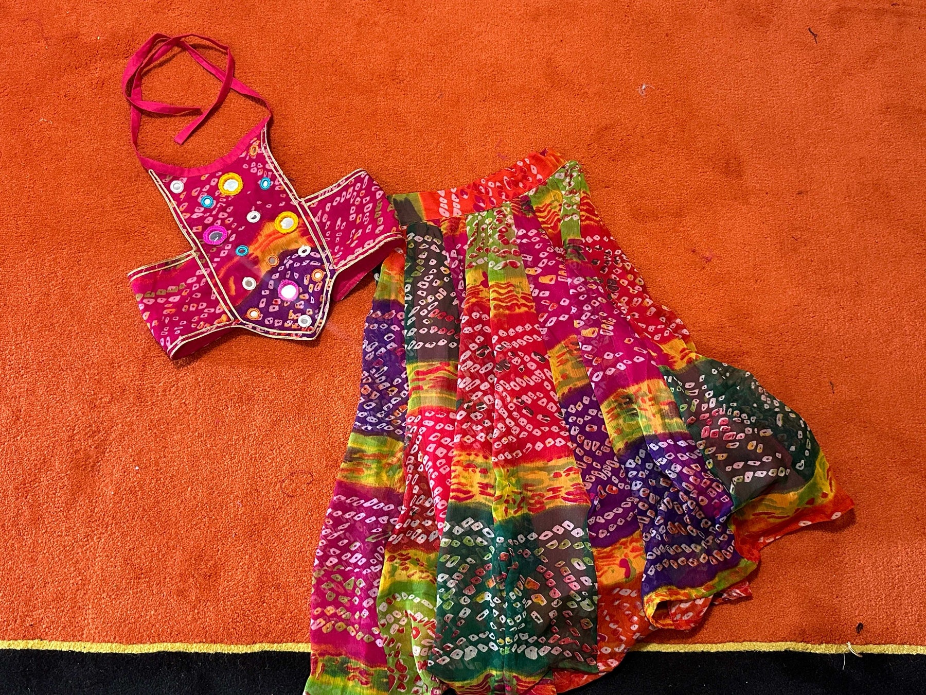 Flared Bandhani Skirt in rich shades of red, green, and yellow tie-dye patterns for a lively, traditional appeal.