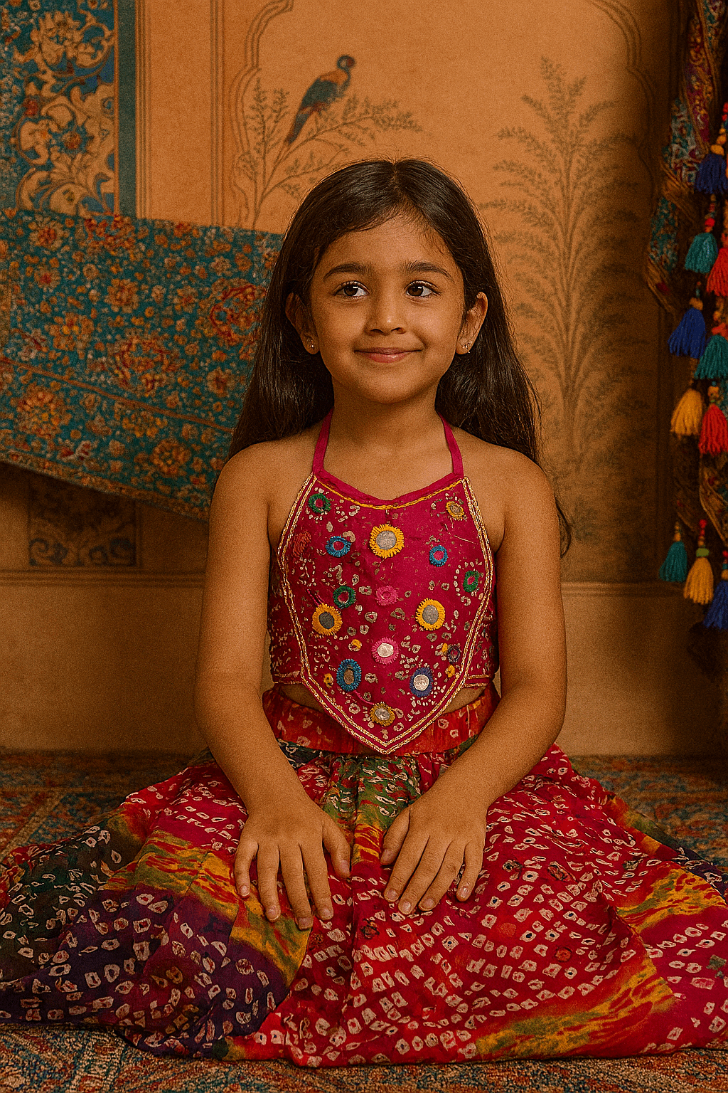 A vibrant and playful Indo-boho kidswear set, perfect for festive occasions, weddings, and cultural celebrations. The outfit features: