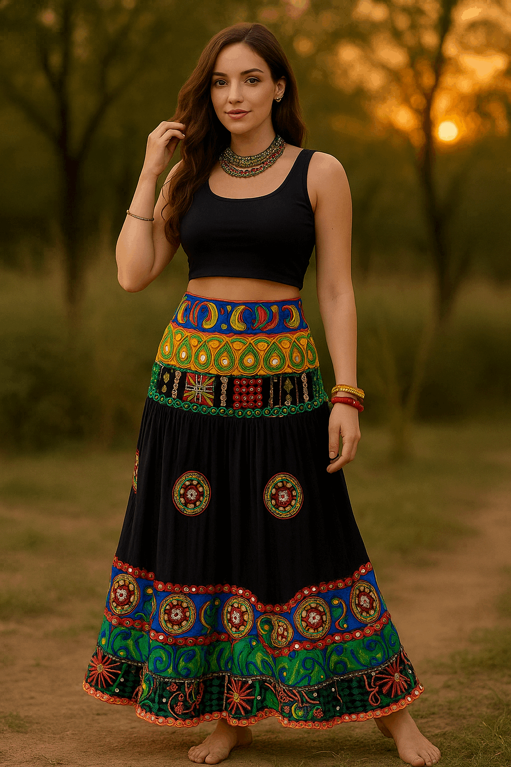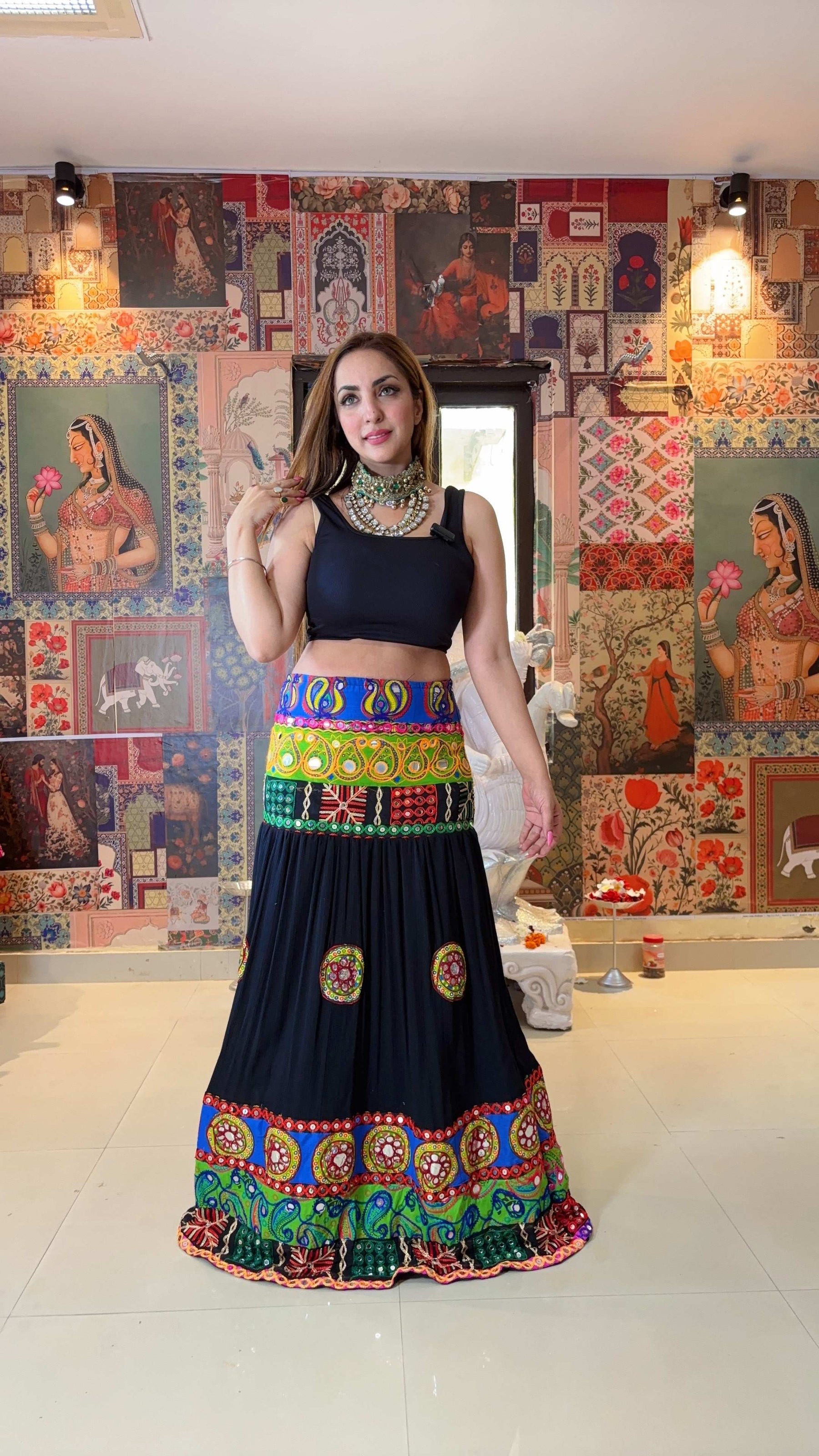 Step into timeless elegance with our Black Boho Mirrorwork Skirt, a stunning piece featuring intricate hand embroidery and vibrant mirrorwork inspired by traditional Banjara craftsmanship. The rich black base creates the perfect canvas for bold, colorful patterns, while the flowy silhouette ensures effortless grace and comfort. Ideal for festive occasions, sangeet nights, cultural events, or statement everyday styling, this skirt brings heritage artistry into modern fashion.