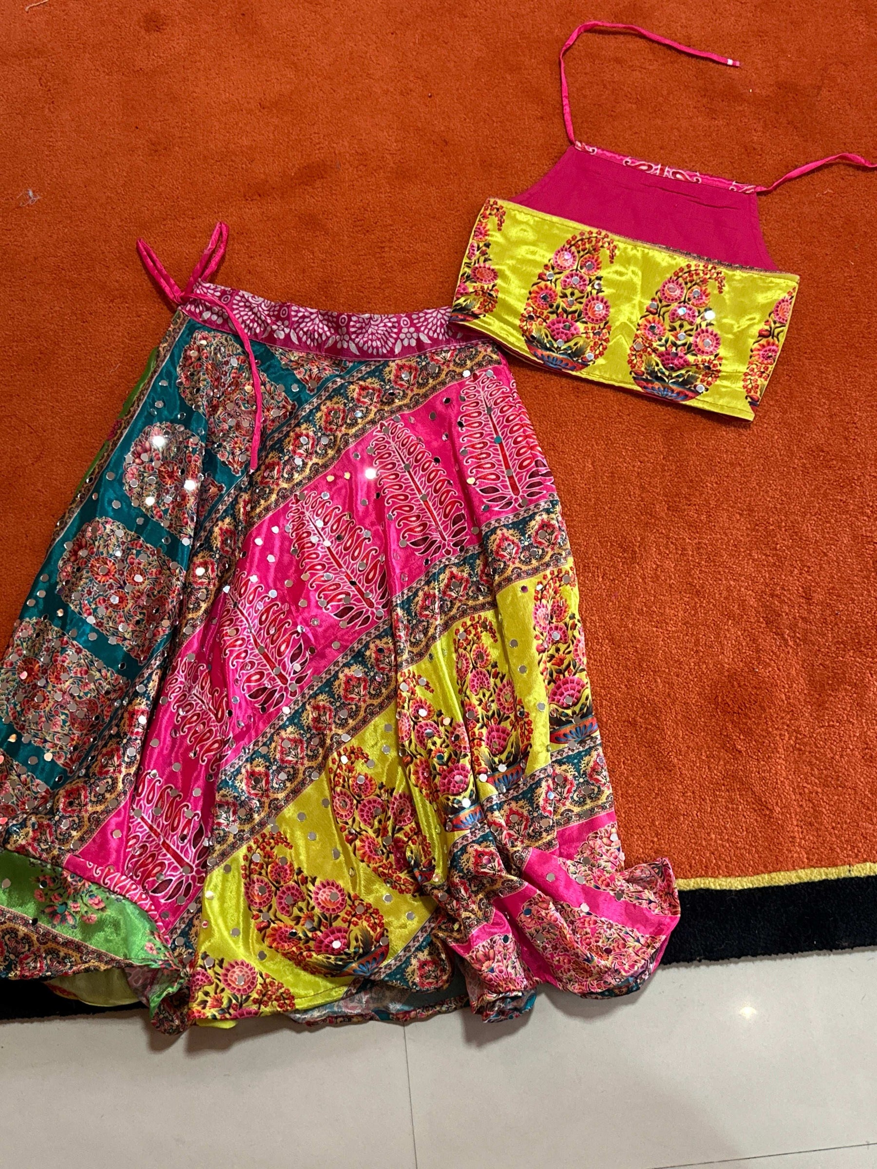 Flared Lehenga Skirt in vibrant pink and green panel design with paisley and floral prints, enhanced with tiny mirror embellishments.