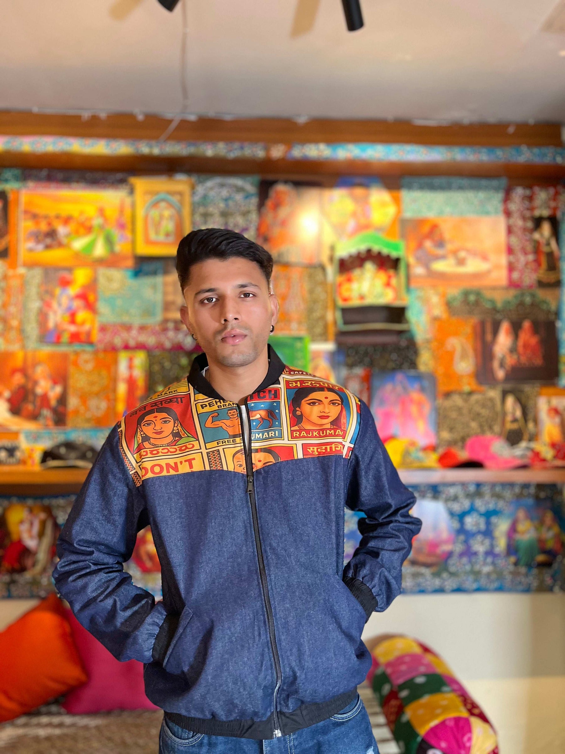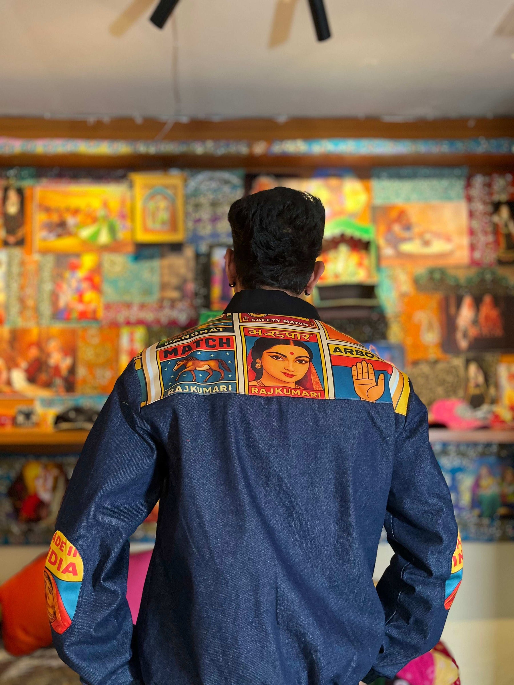 Make a bold style statement with this Denim Bomber Jacket, designed with a mix of retro Indian matchbox and vintage poster patchwork across the shoulders and chest. The vibrant artwork brings alive India’s nostalgic pop-culture vibe, while the denim base keeps it classic and versatile.