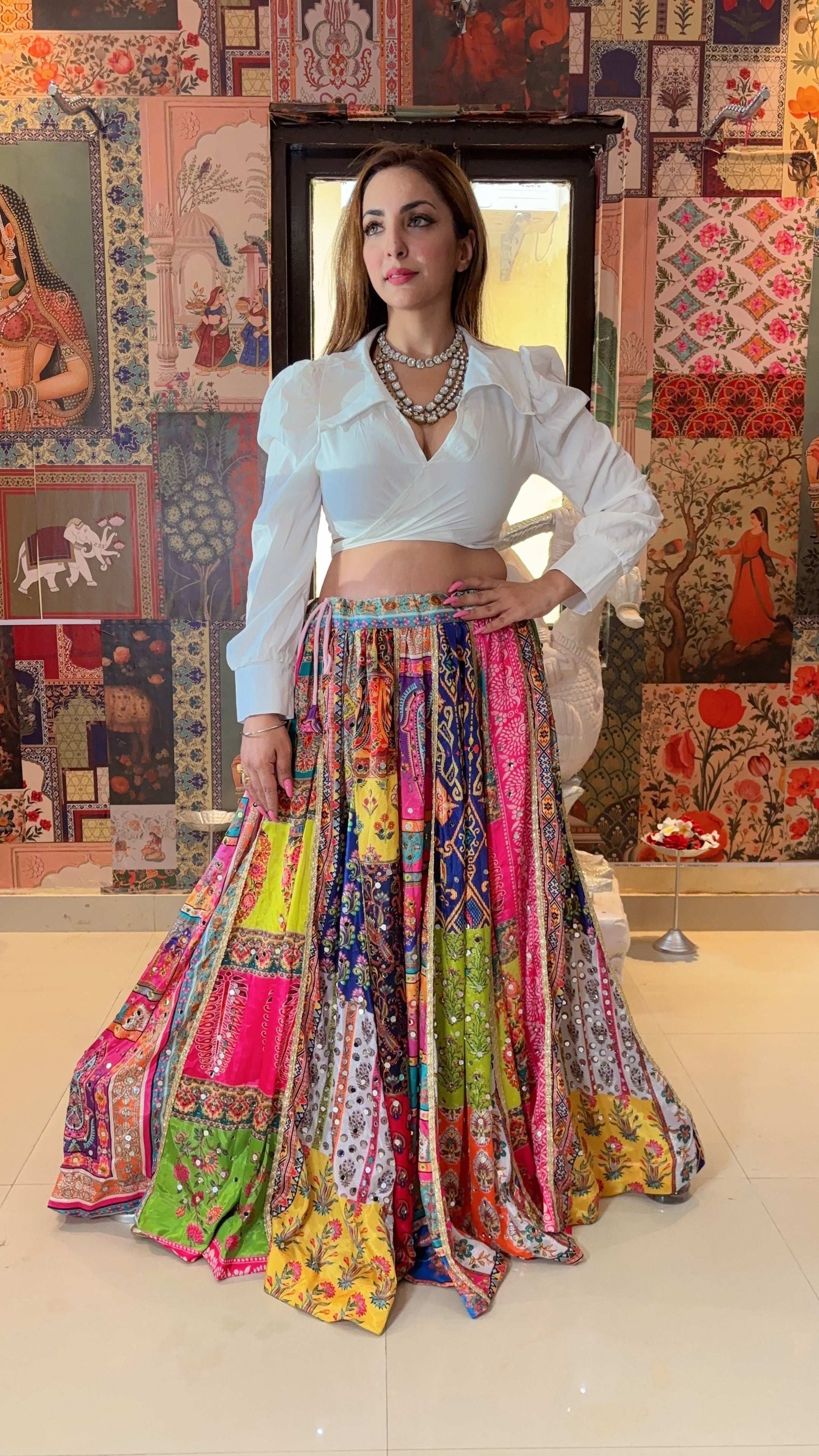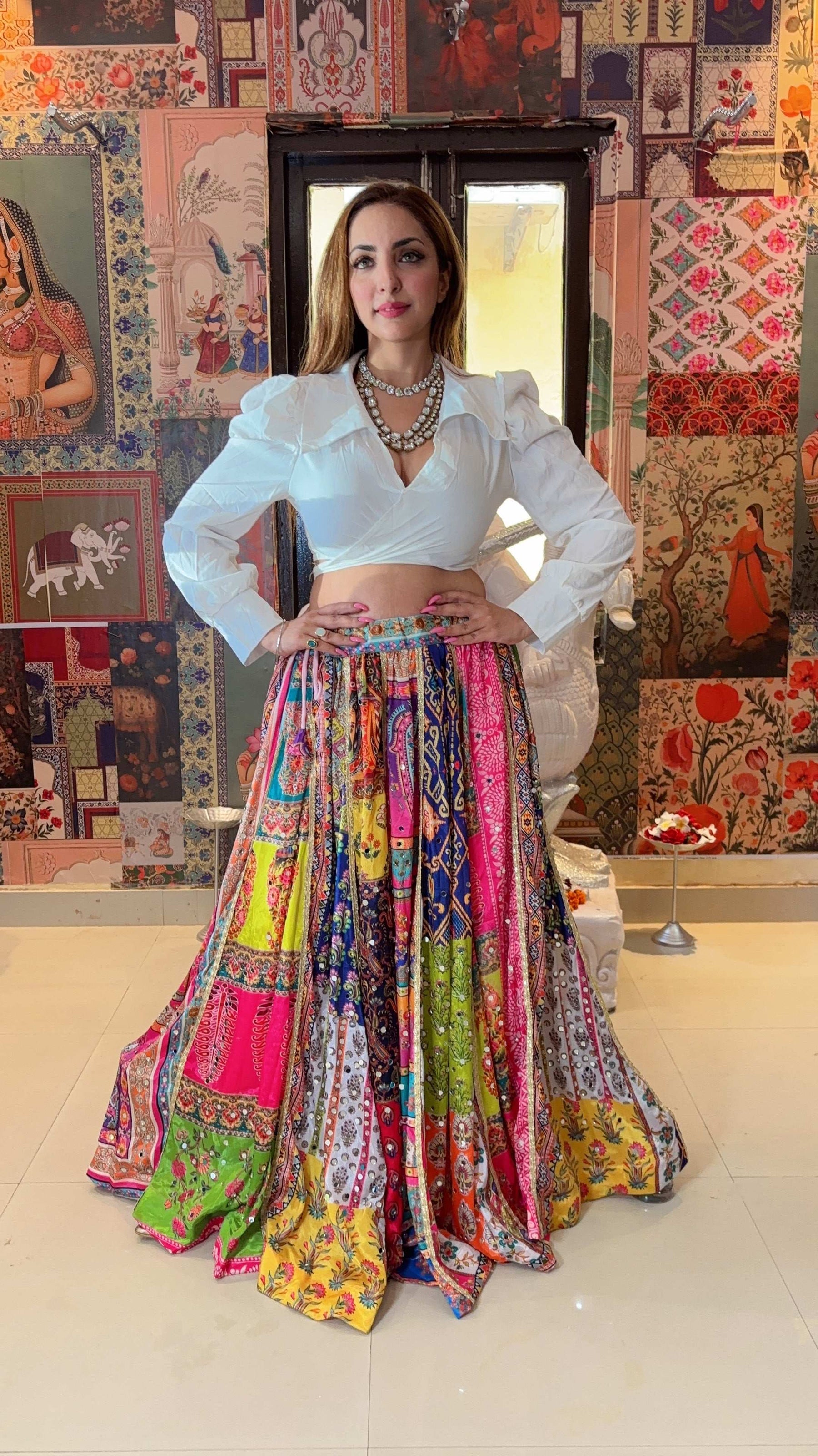 Turn heads with our Bohemian Multicolor Patchwork Maxi Skirt, a vibrant statement piece that celebrates traditional Indian craftsmanship. This skirt features a stunning blend of patchwork panels in bright pink, green, yellow, blue, and orange, each adorned with intricate prints and embroidery. The full flared silhouette creates an elegant flow, perfect for festive occasions, destination weddings, and cultural events.