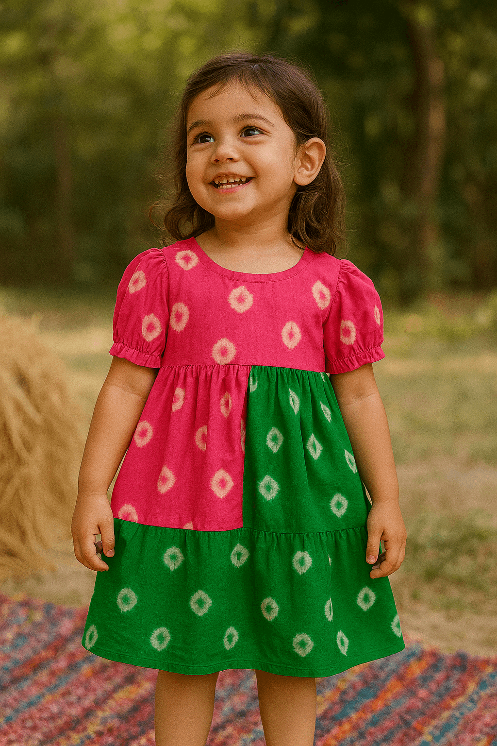 Playful, bright, and absolutely adorable – this pink and green dual-tone dress is made for twirls and smiles! Crafted from breathable cotton, it features soft puff sleeves and a relaxed tiered silhouette, decorated with traditional tie-dye-inspired diamond motifs. The color-block design adds a fun festive touch, making it perfect for both casual and celebratory occasions.