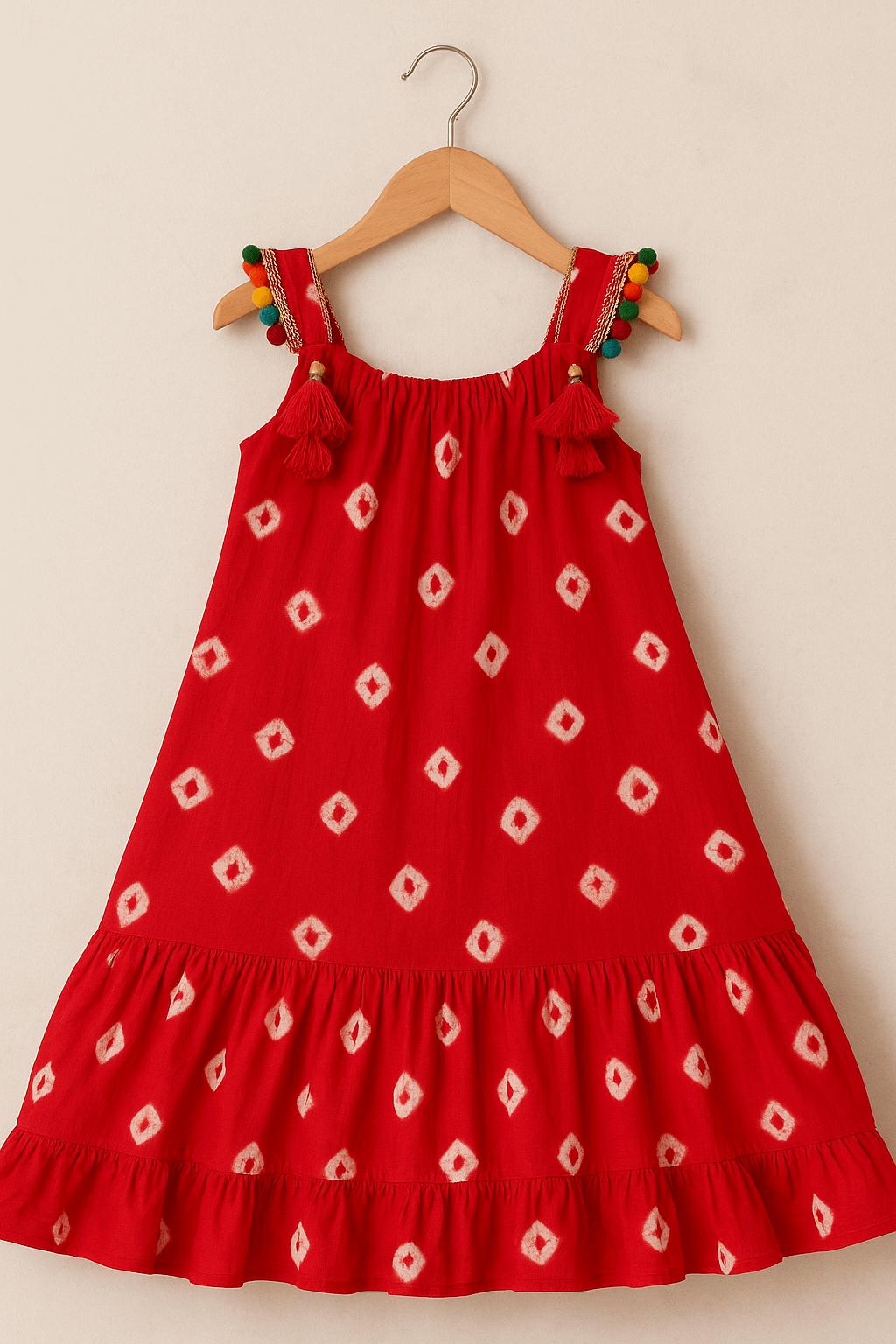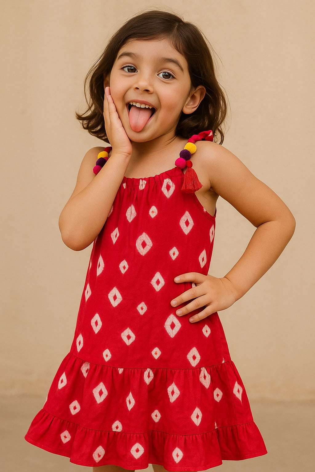Add a playful pop of color to your little one’s festive wardrobe with this adorable red ikat dress! Featuring soft shoulder straps with multicolor pom-poms and cute tassel tie-ups, this A-line dress is made from breathable cotton for maximum comfort. The gathered flare hem adds a twirl-worthy finish – perfect for birthdays, festivals, and family outings.