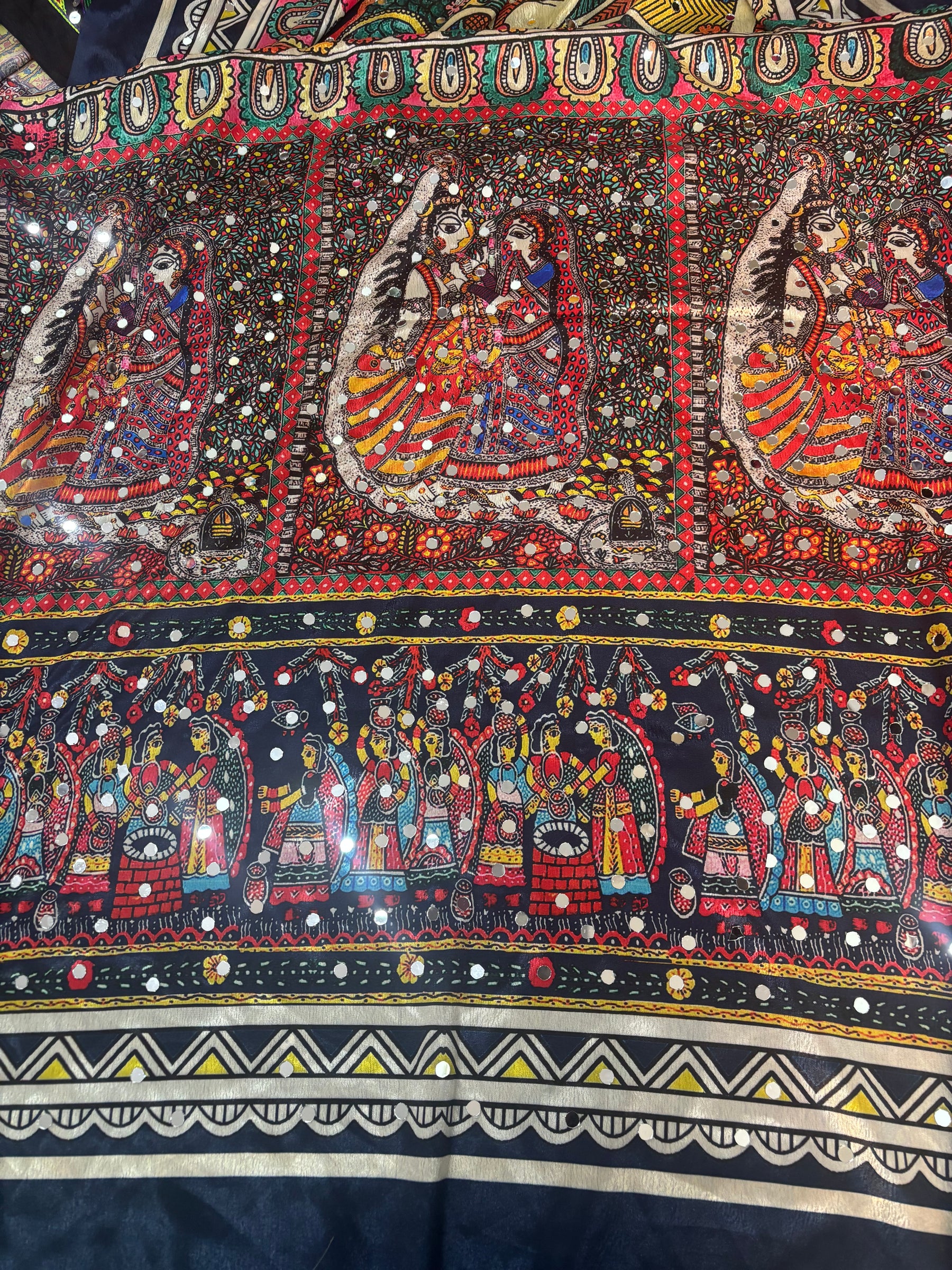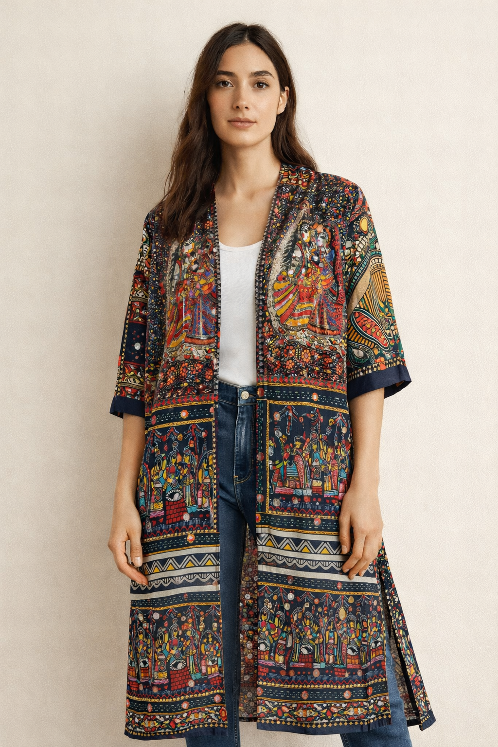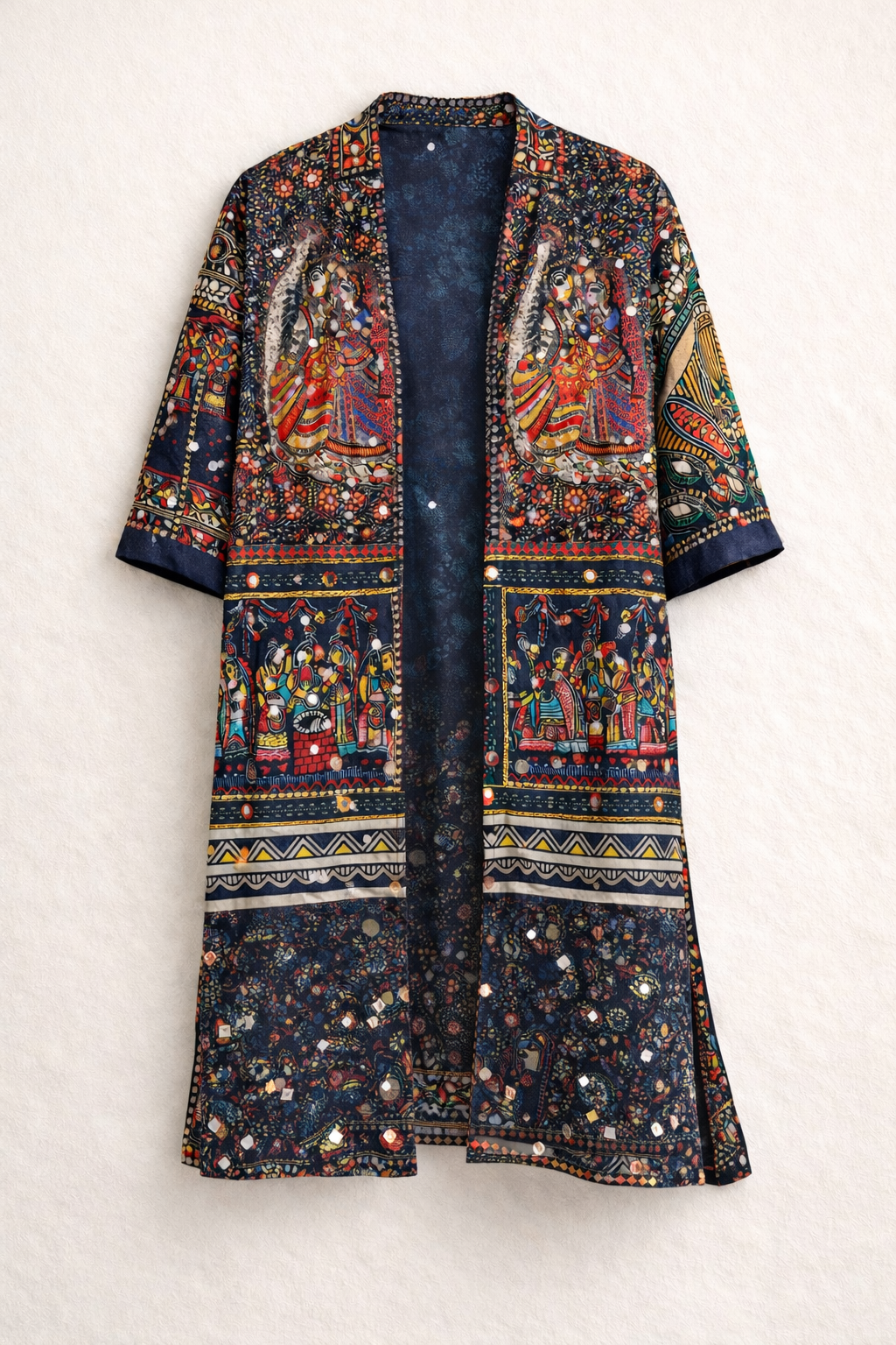 A modern heirloom layer featuring an Indian abstract narrative brought to life on fluid crepe. Finished with hand-glued mirrors that catch the light subtly, the Sheesha Story Shrug blends craft, movement, and contemporary ease. Designed for effortless layering—day to after-hours.