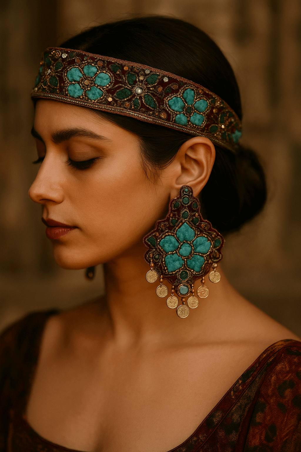 A striking accessory set that fuses royal elegance with bohemian artistry. This handcrafted velvet headband and statement earring duo is adorned with teal floral embroidery, gold beadwork, and sequin detailing. The earrings feature bold floral motifs with cascading coin charms, adding a touch of drama and luxury. Perfect for bridesmaids, festive occasions, or anyone looking to make a statement.