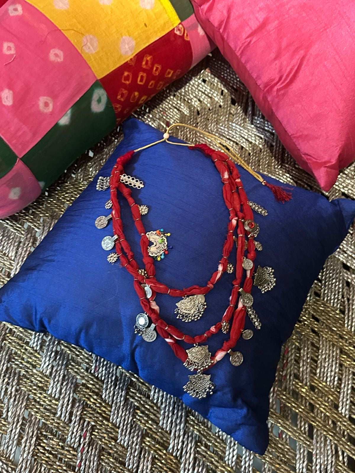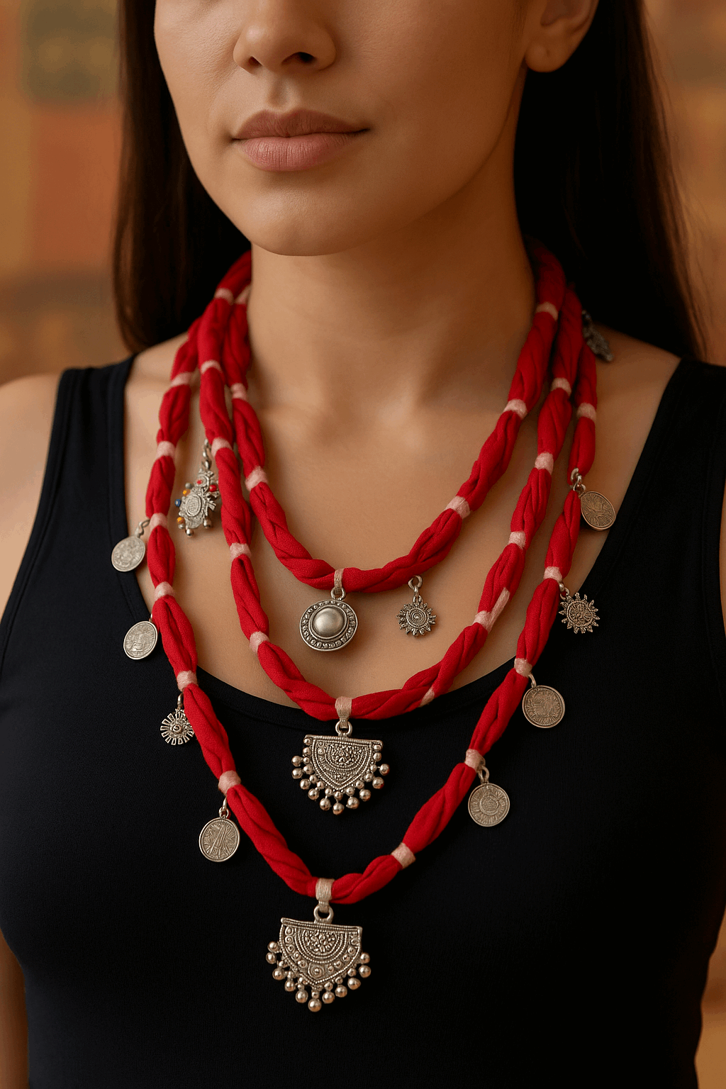 Infuse your look with bold boho vibes through our Tribal Tinkle Red Fabric Necklace. Featuring layered red tie-dye cotton cords with oxidized silver tribal charms, coins, and motifs, this piece is a rustic celebration of nomadic spirit and handmade artistry. A perfect pick for indie souls and festive styling.