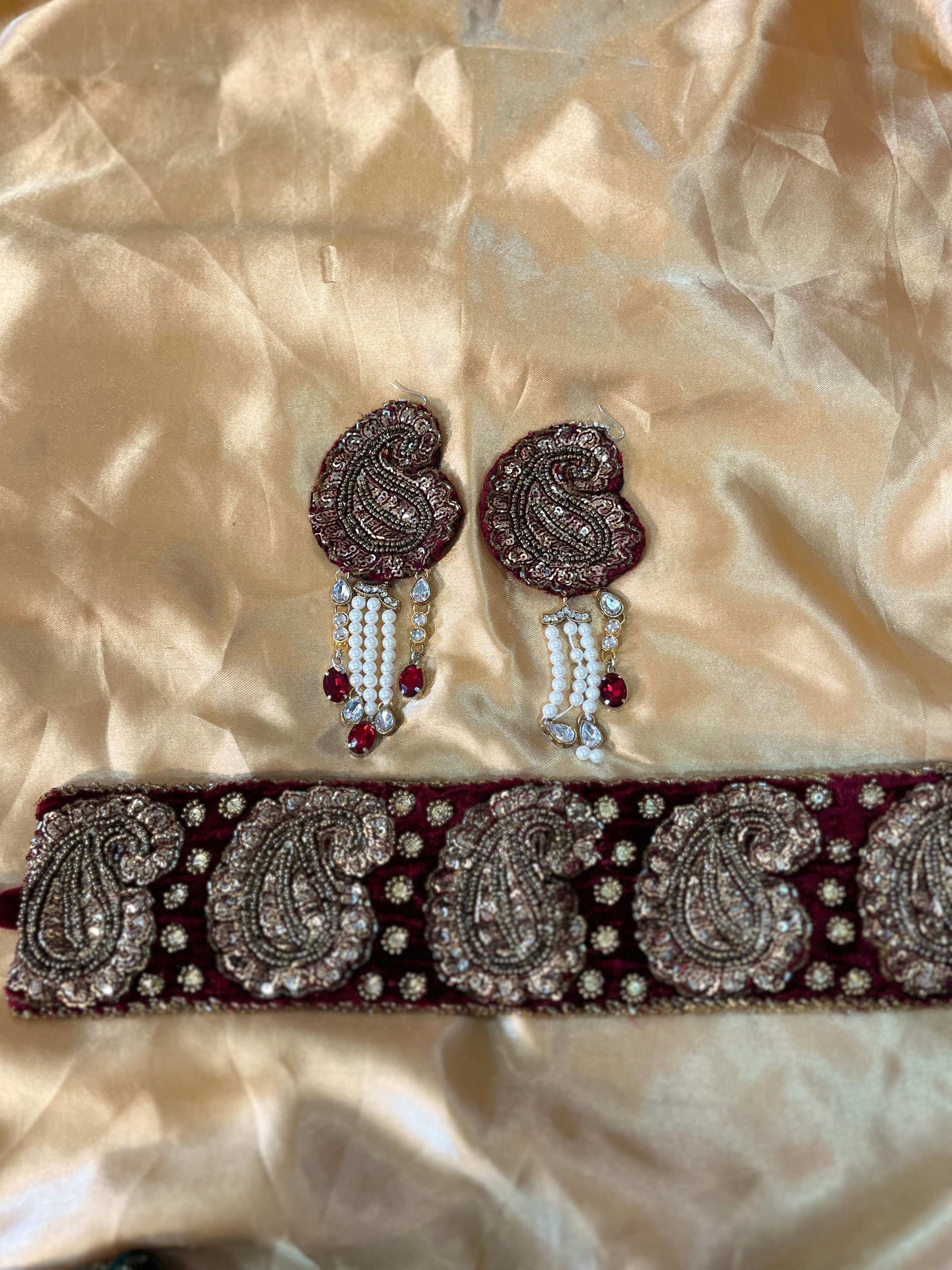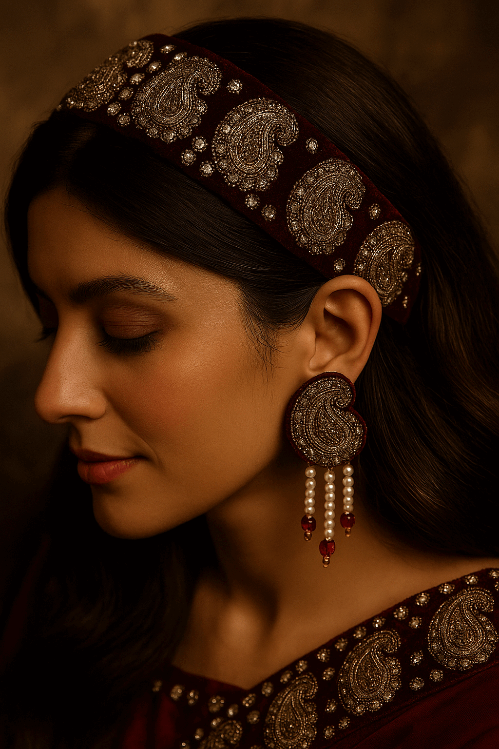 Elevate your festive and wedding look with this regal maroon velvet headband and earring set, intricately hand-embroidered with golden zari, sequins, and crystal embellishments. The broad velvet headband features ornate paisley motifs, while the statement earrings mirror the same design, cascading with pearl and ruby-red bead drops. A perfect fusion of heritage craftsmanship and modern styling, this set is made to turn heads.