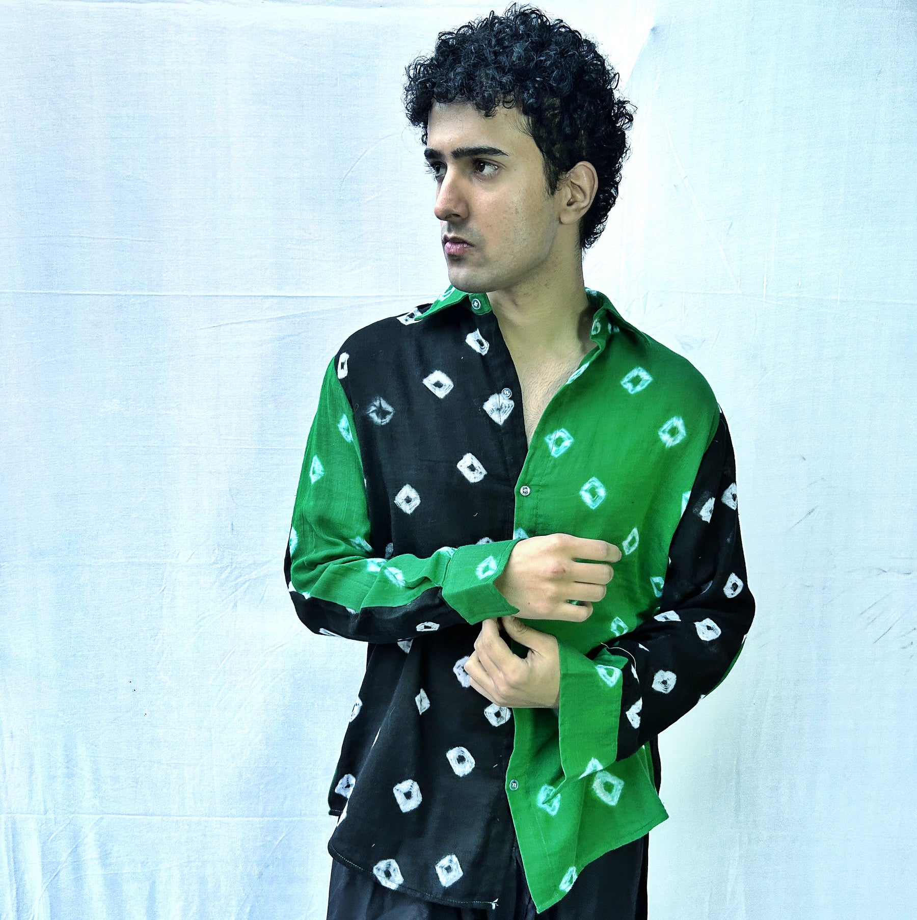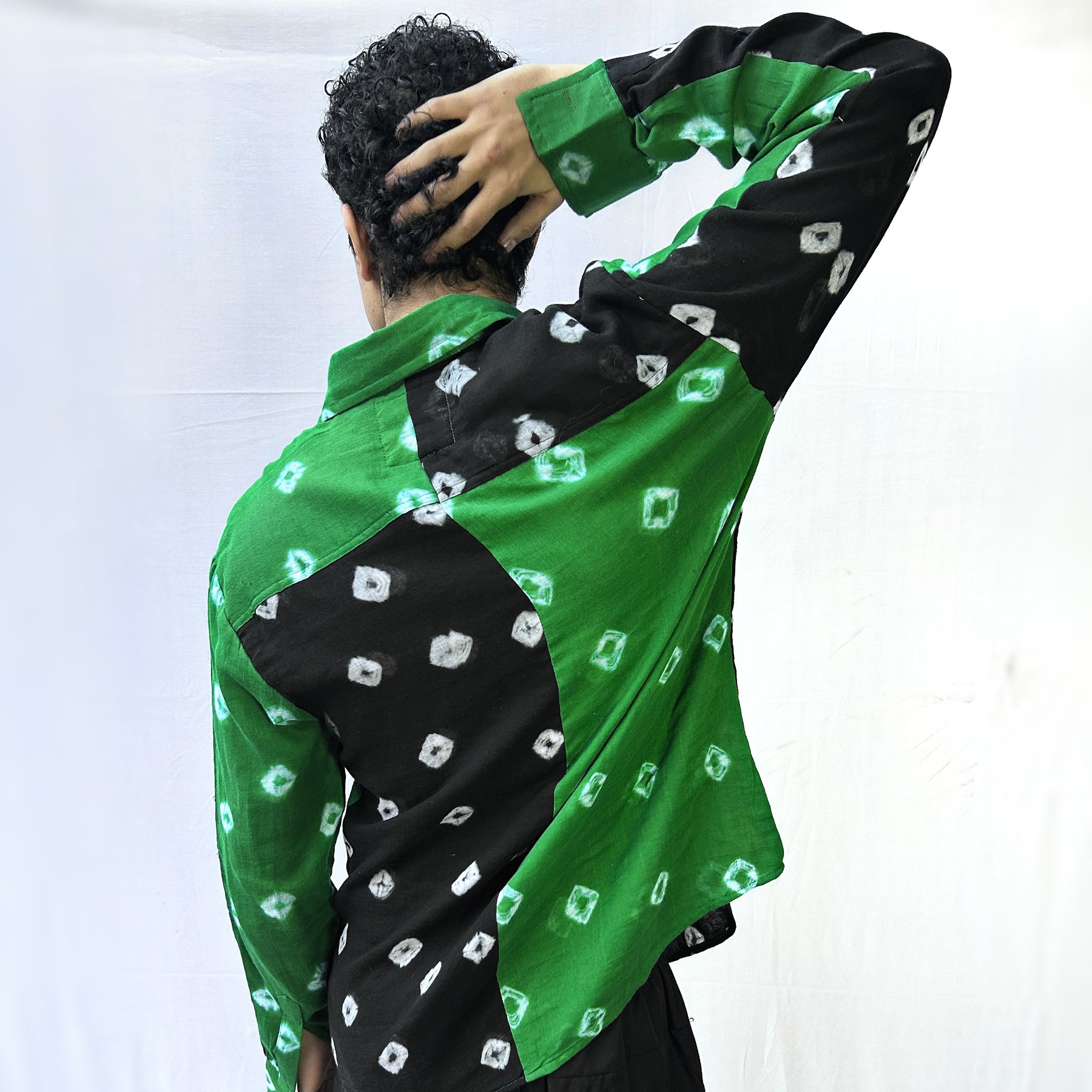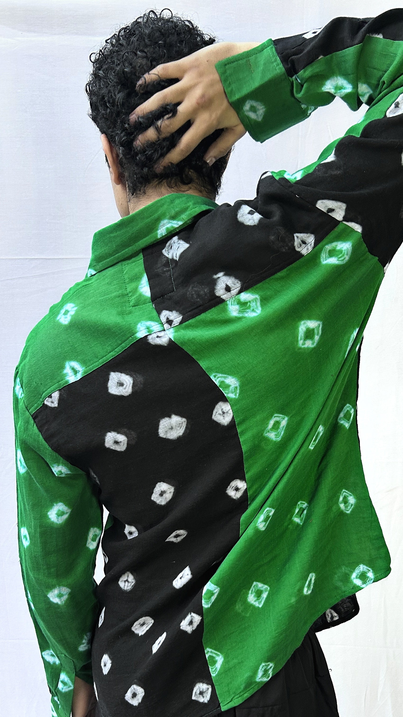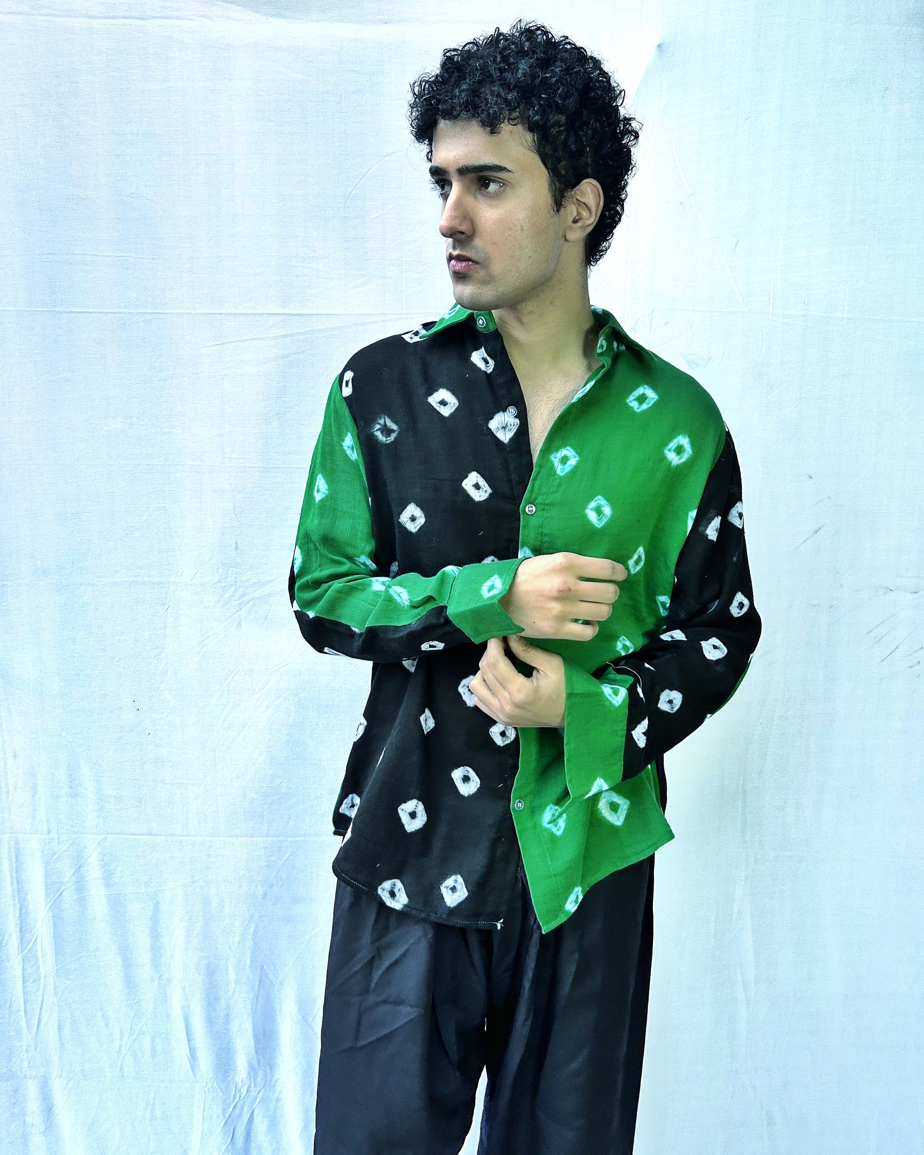 Rooted in tradition yet styled for the modern wardrobe, the Emerald Noir Bandhani Shirt is a striking fusion of earthy green and deep black hues. Crafted using the age-old Bandhani tie-dye technique, this dual-tone shirt brings together bold contrast and handcrafted charm in a contemporary silhouette.