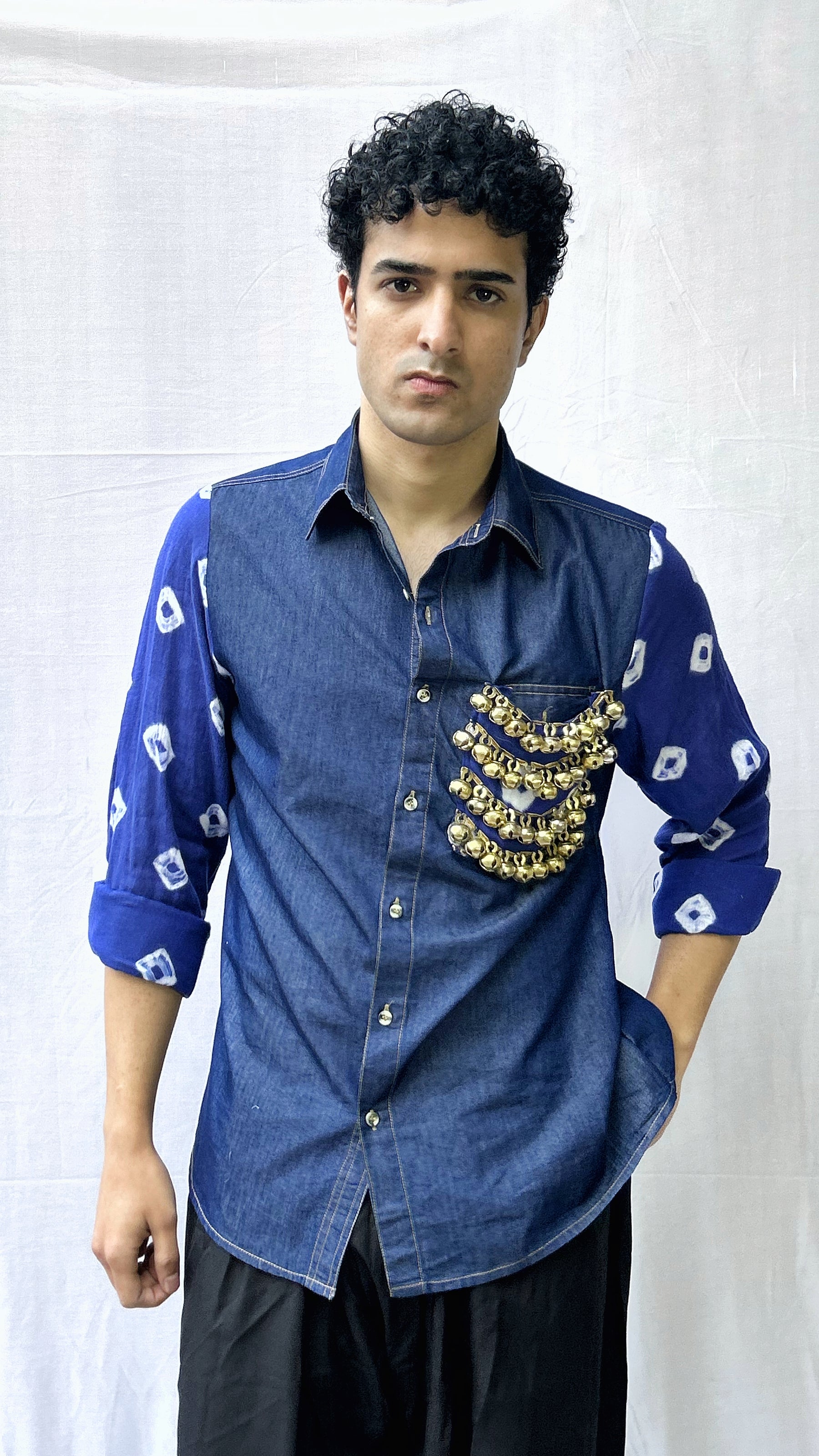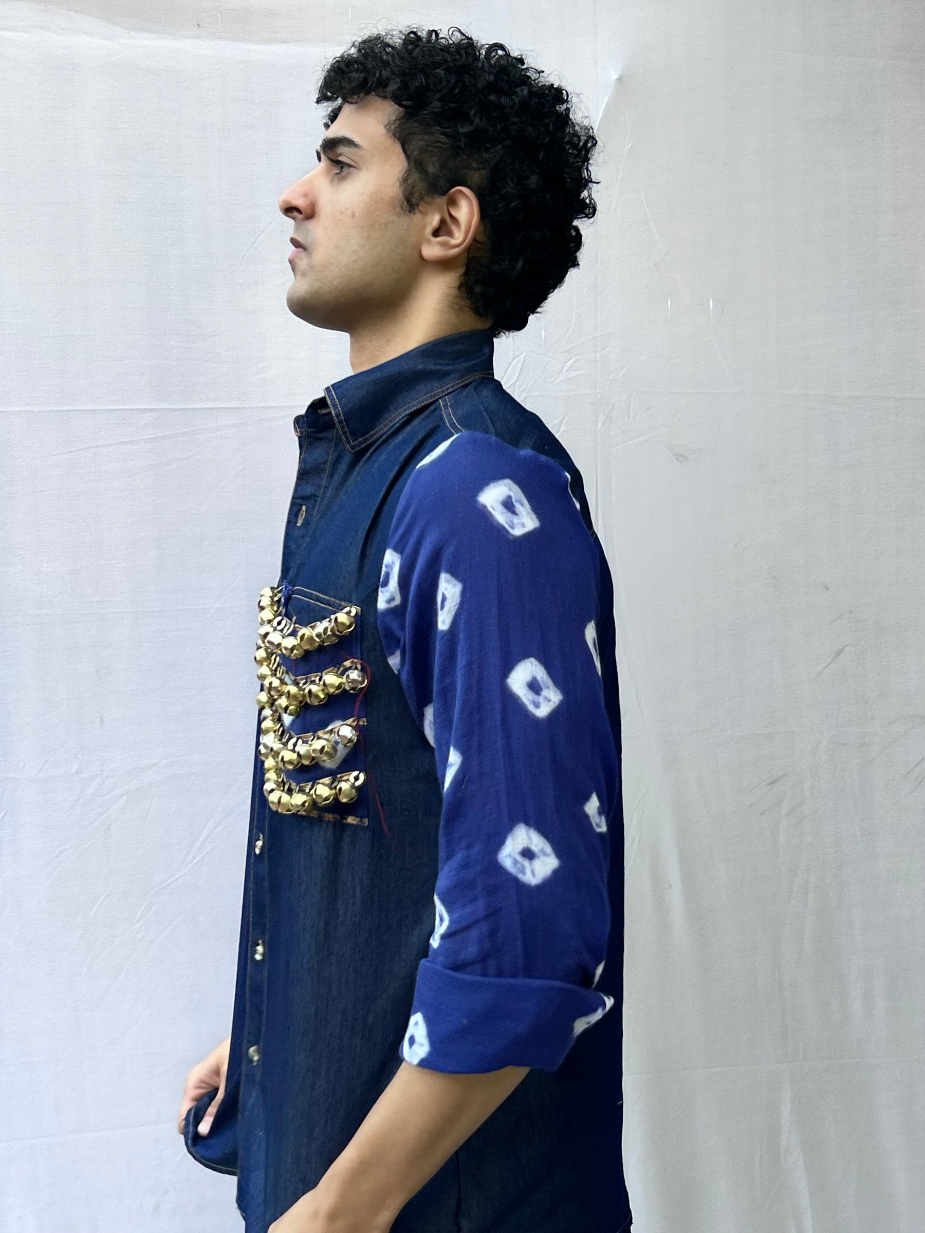 A bold blend of tradition and contemporary craft, the Neelkaar Ghungroo Bandhani Denim Shirt redefines statement menswear. Crafted in rich indigo denim, this shirt is elevated with contrast bandhani-print sleeves and striking metallic shell-inspired embellishments on the chest pocket.