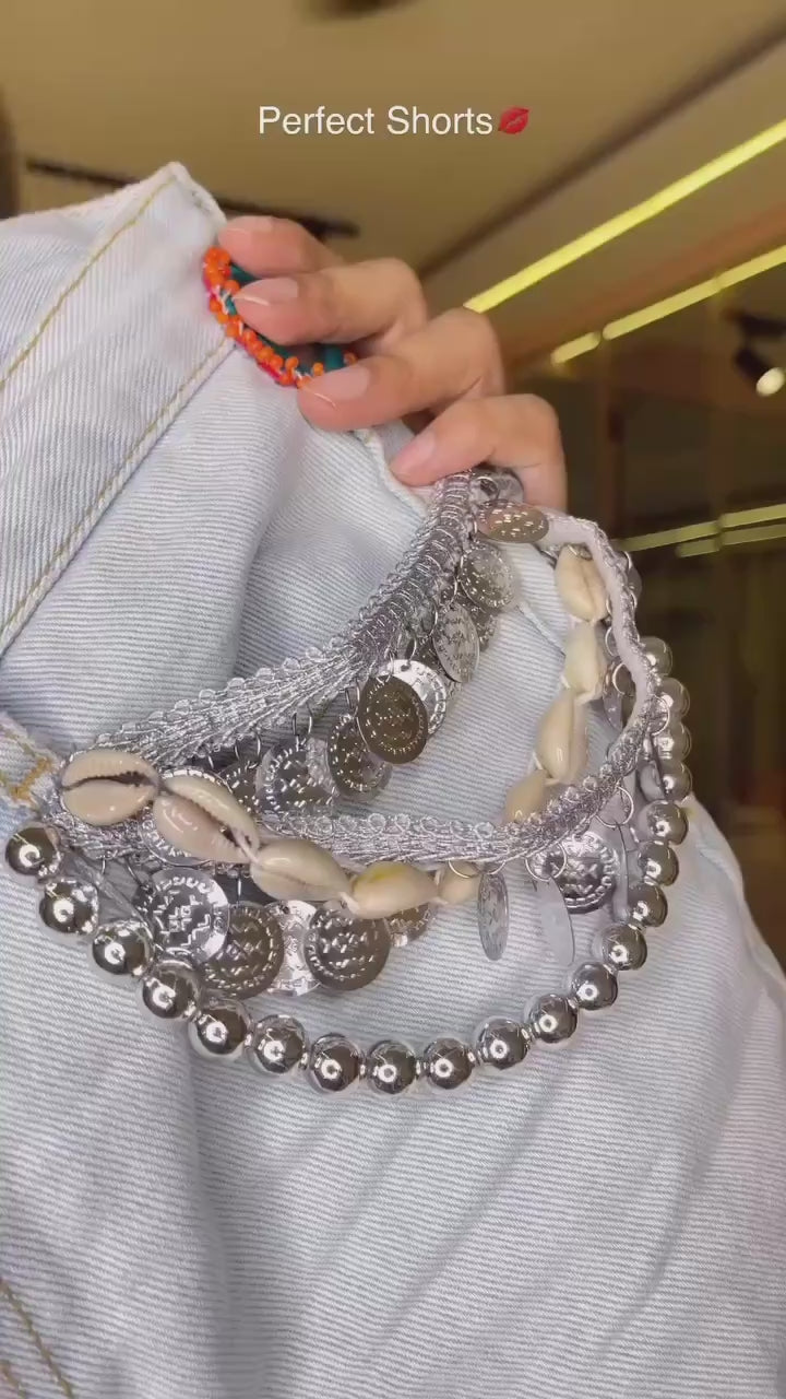 Mystic Sands Rhinestone Chain Patchwork Shorts: These boho-chic shorts are a sight to behold, with their mesmerizing patchwork design and dazzling rhinestone chains, making a statement wherever you go.