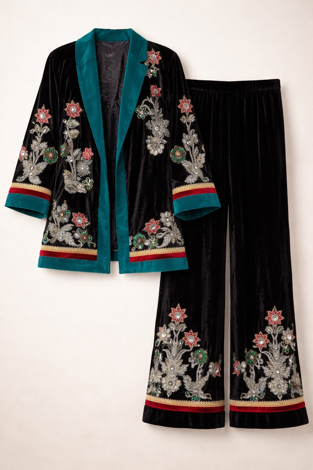 - Two-piece set: embellished velvet kimono + embellished velvet palazzo pants