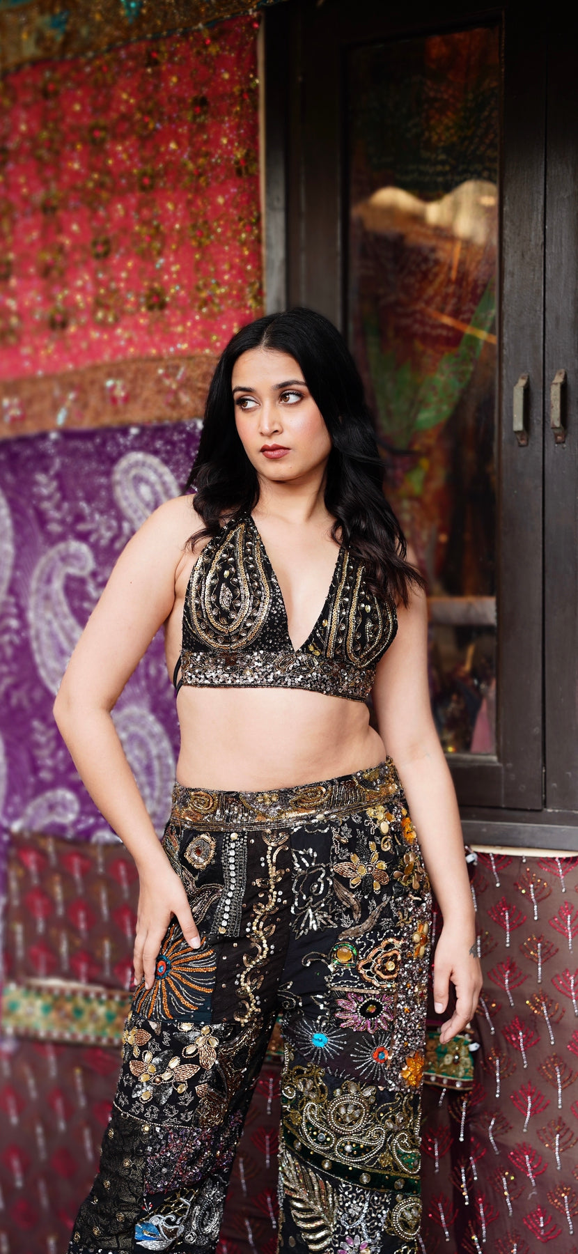The Aarzoo Embellished Set is a fully hand-embroidered patchwork ensemble designed to blur the line between heirloom craftsmanship and modern sensuality. Featuring a bralette-style top paired with fluid embellished pants, this set is unapologetically bold yet meticulously refined.